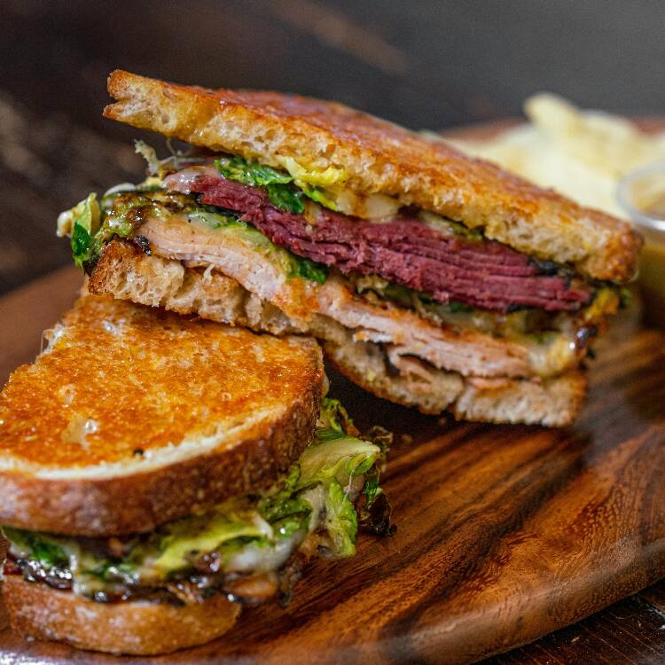 Pan blanco artesanal, jamón ahumado, mezcla de quesos, tocino y aderezo chipotle. Con papas o ensalada.