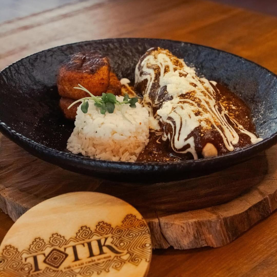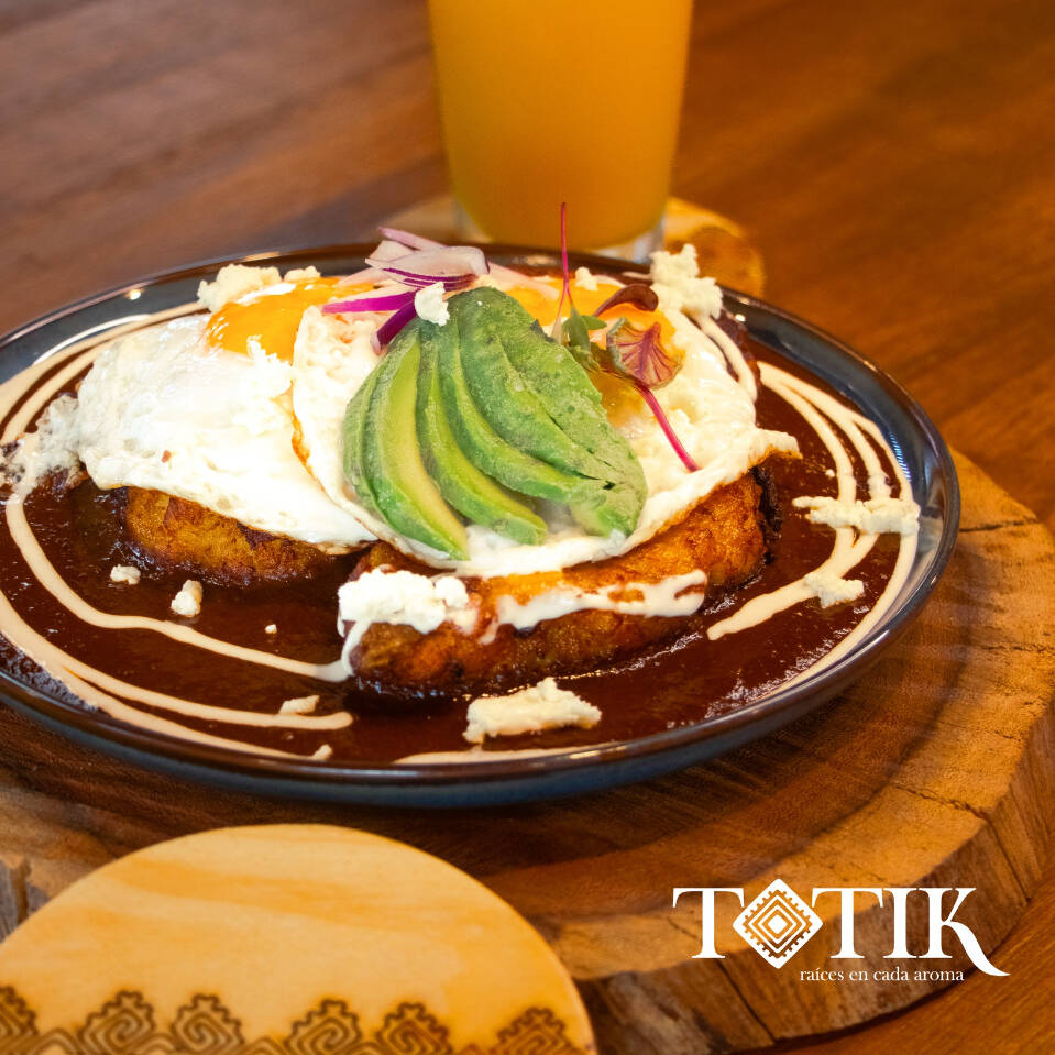 Huevos estrellados sobre molotito de plátano, bañados con mole chiapaneco, crema, queso y aguacate.