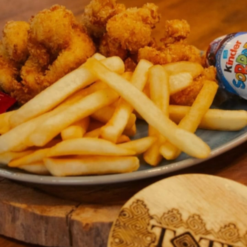 Tiras de pollo empanizadas. Incluye papas y Kinder Sorpresa.