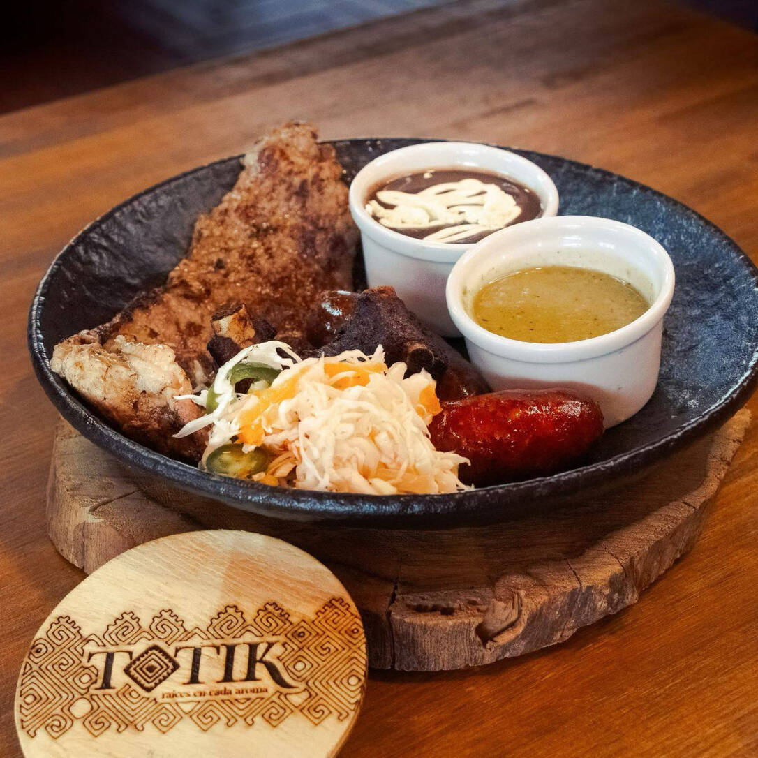 Res marinada, embutidos, sabanita de res, costillas, chorizo y longaniza. Con frijoles, crema y queso.