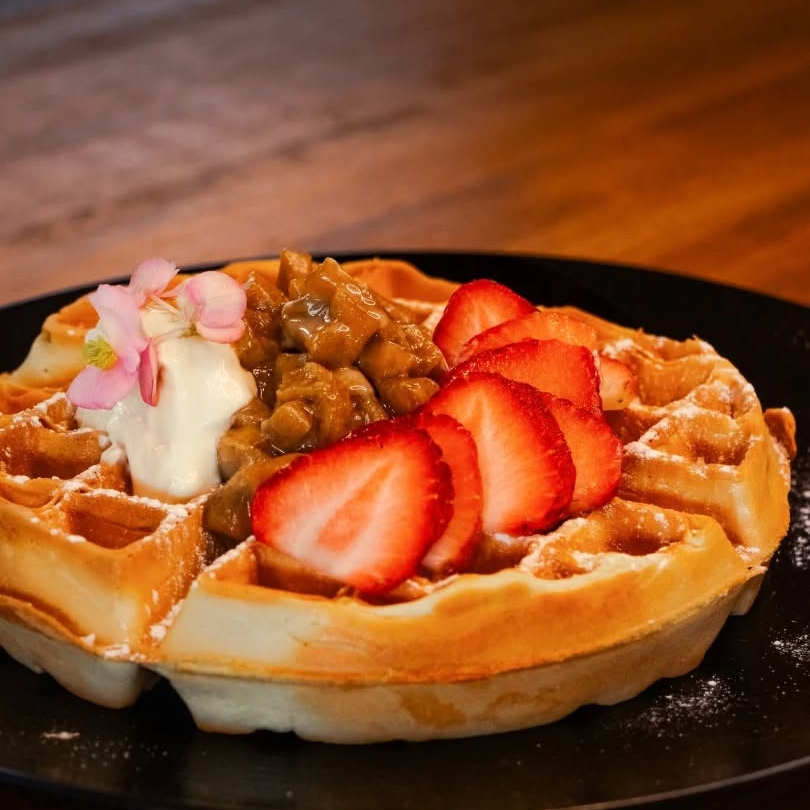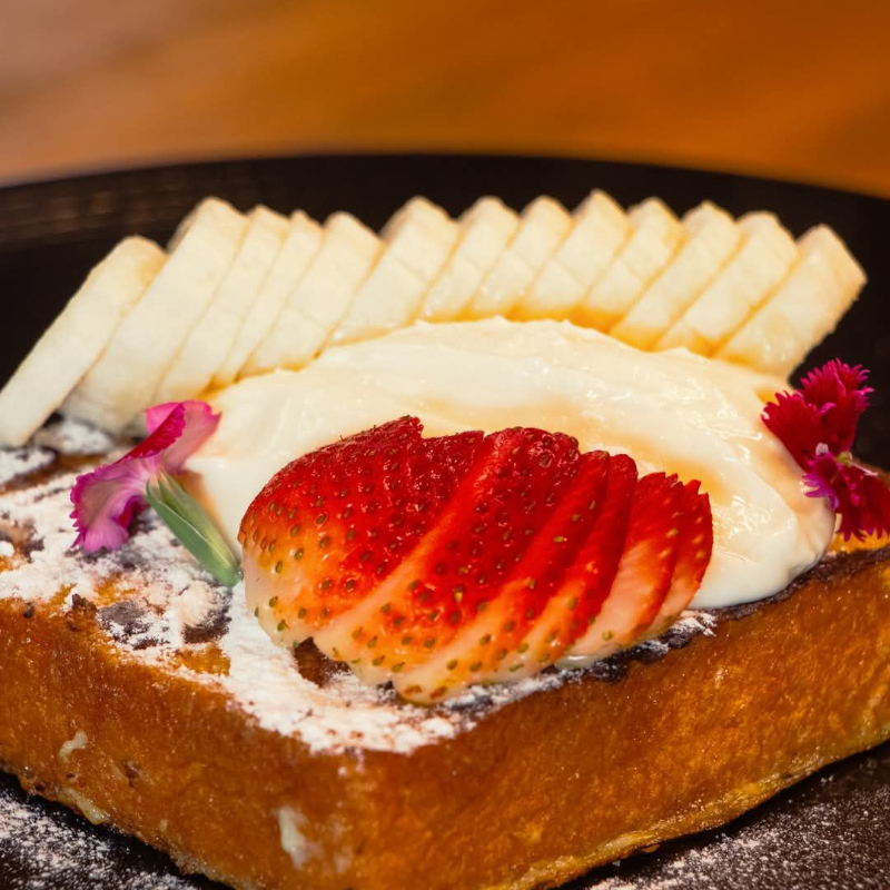 Pan brioche bañado con mezcla de la casa, azúcar glass, fresas, plátano y crema suiza.