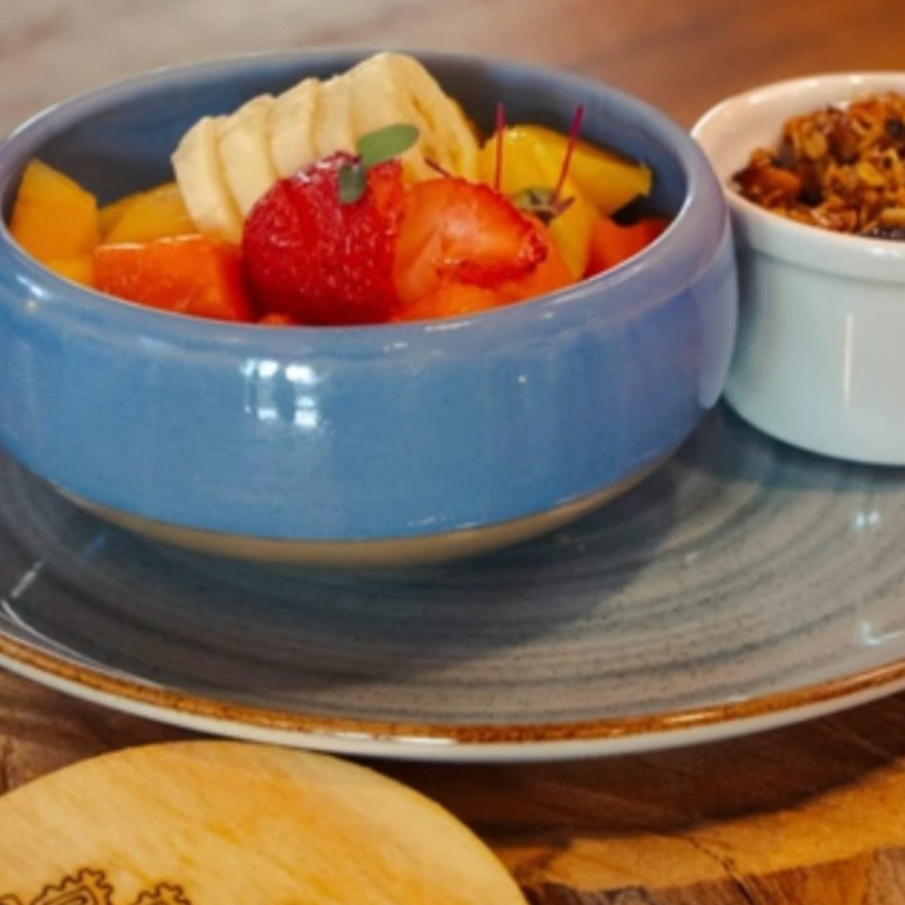 Fruta de temporada con granola y miel de abeja.