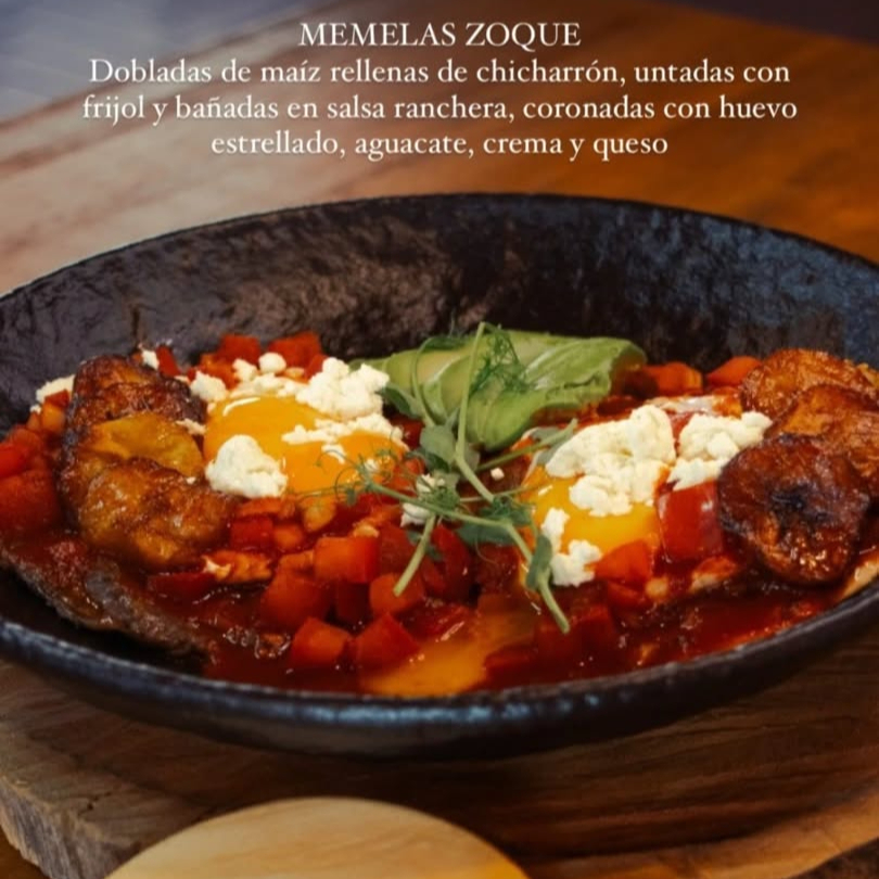 Huevos estrellados sobre una memela con frijoles, bañados con chirmol, pepita, crema, queso Chiapas y aguacate.