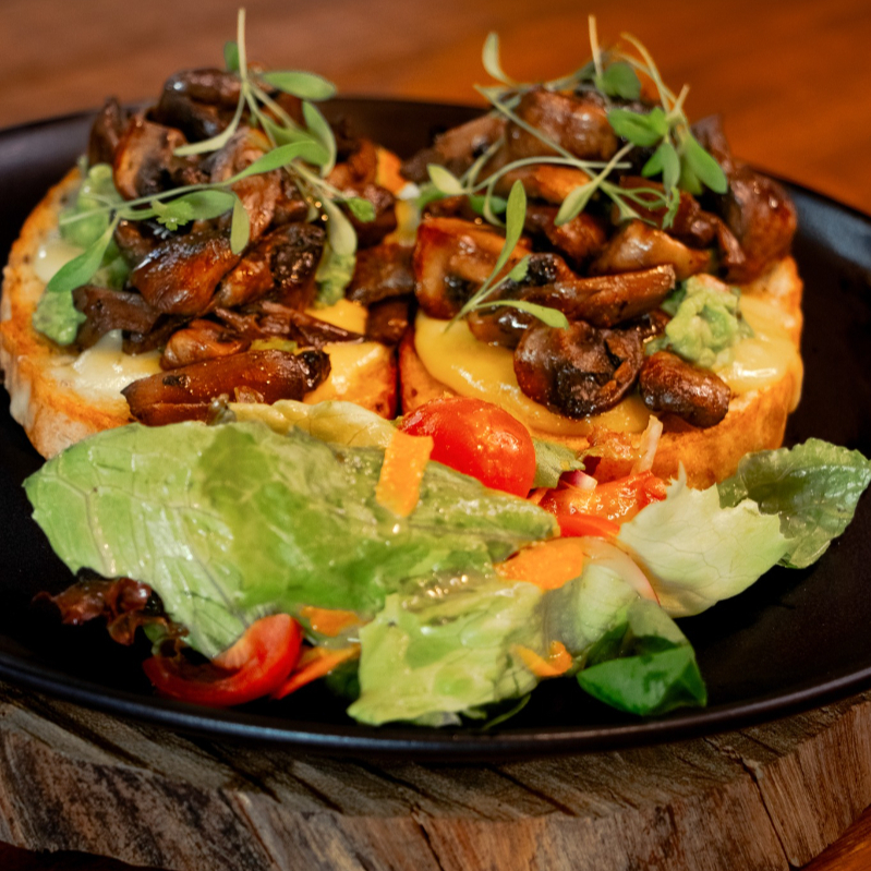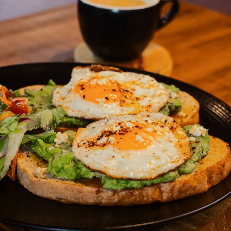 Pan de semillas tostado con guacamole, huevos pochados, aceite de oliva, polvo de chiles y queso Chiapas. Con ensalada.