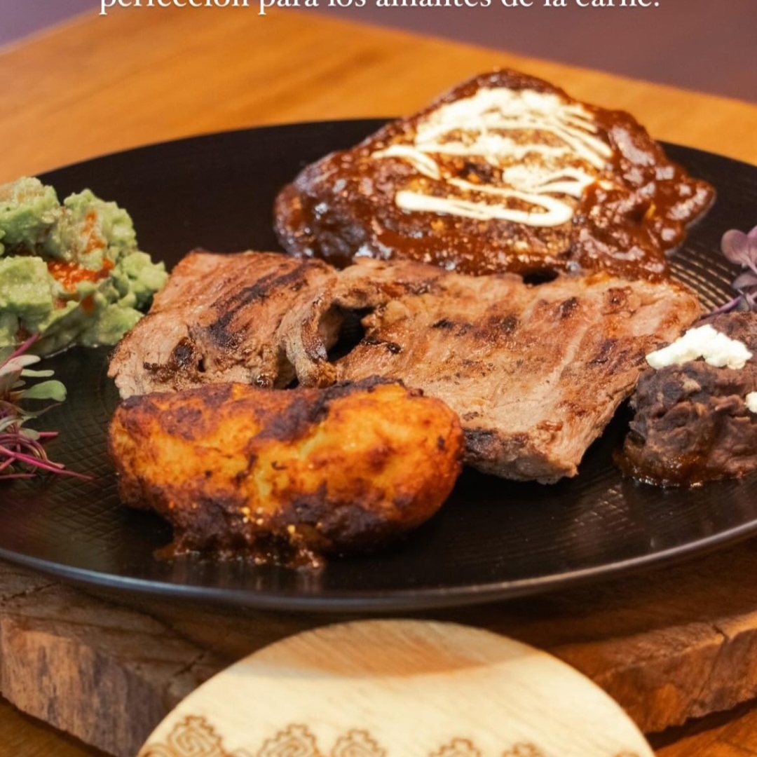 Arrachera (250 g) con enmolada, tortita de plátano, frijoles y guacamole.