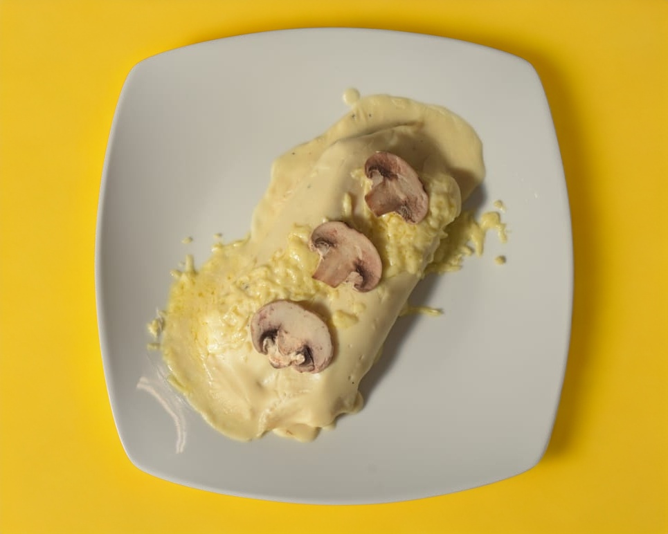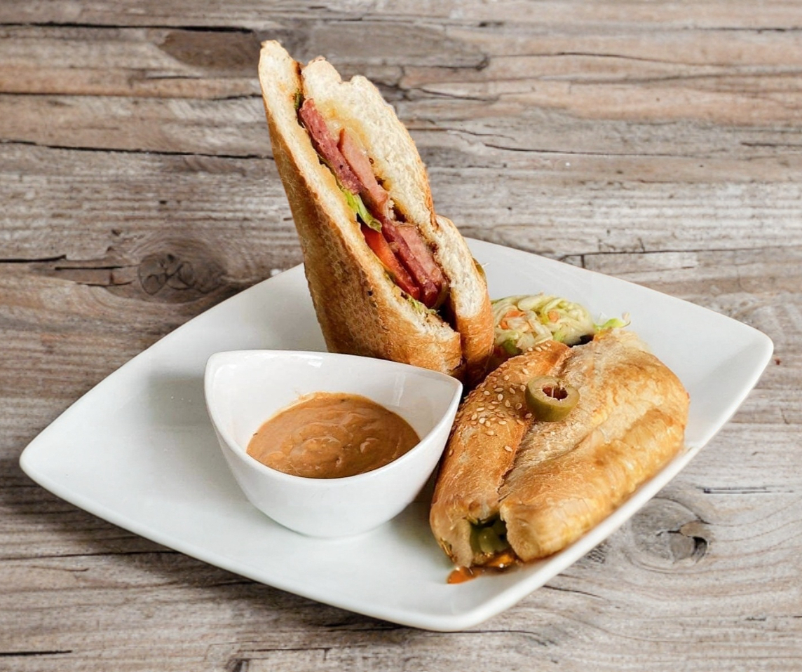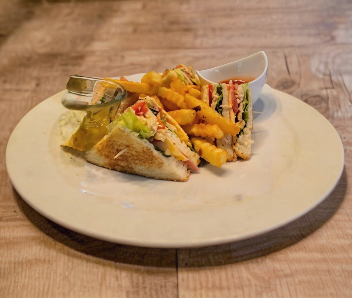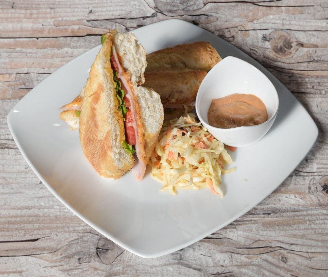 Relleno de jamón, queso americano, pollo, lechuga, tomate y cebolla. Acompañado de papas fritas.