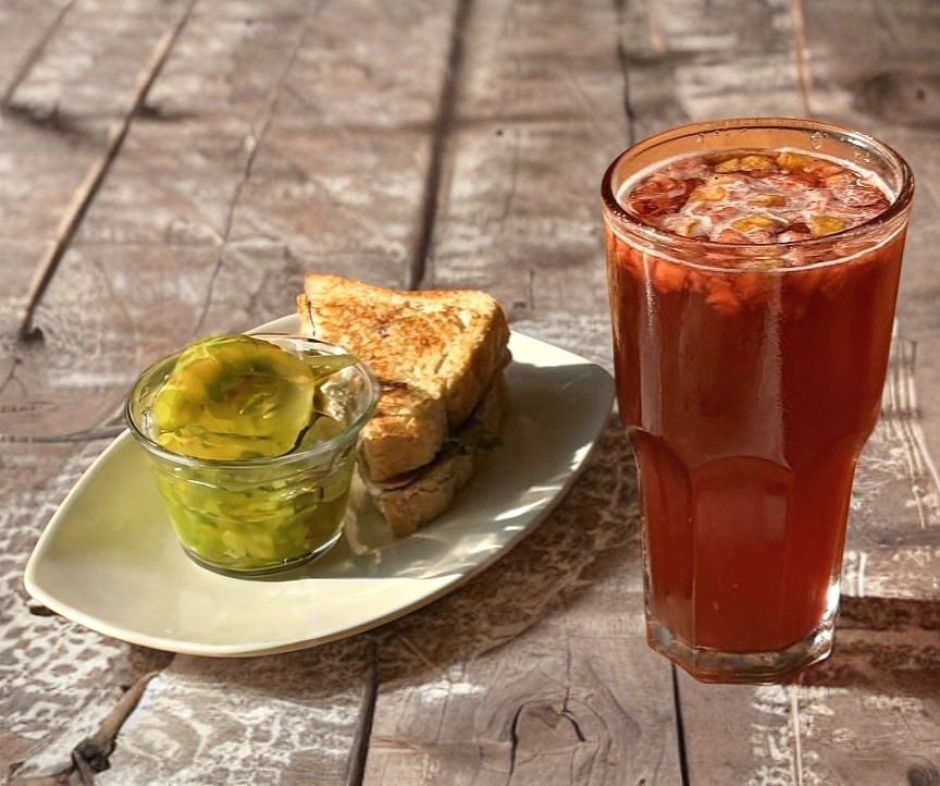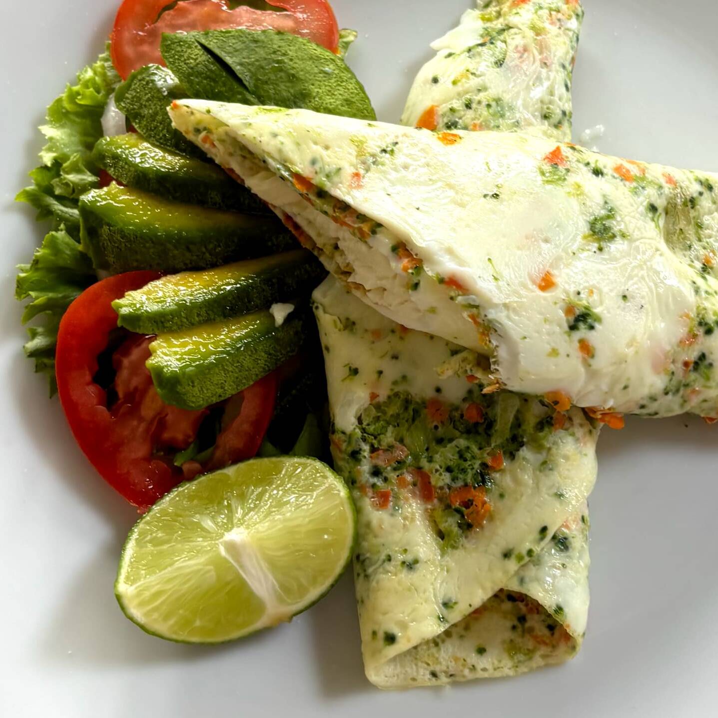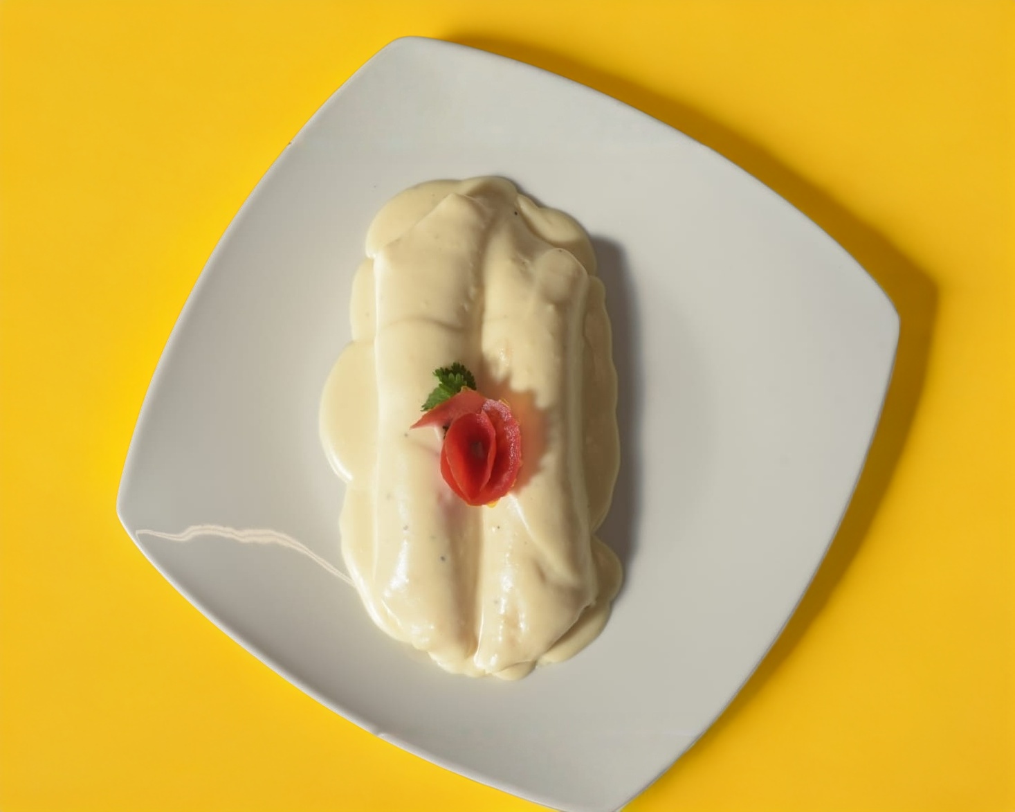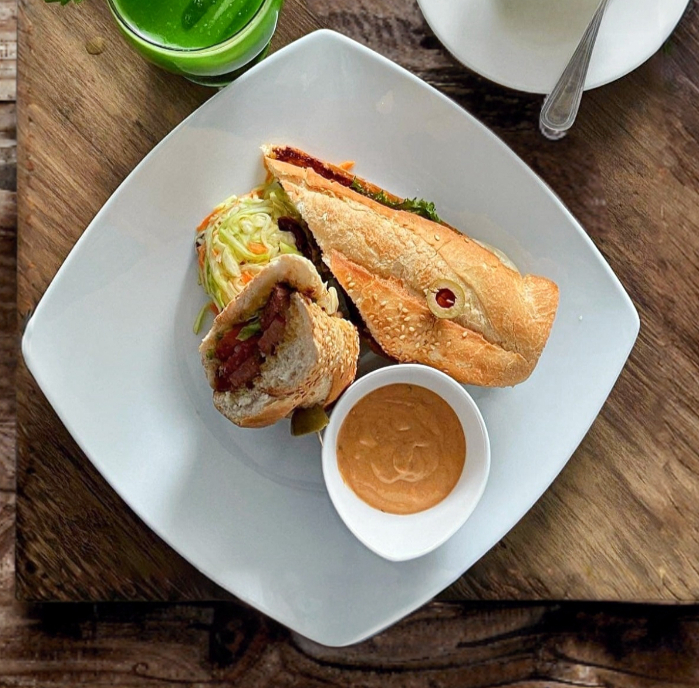 Relleno de jamón, queso americano, pollo, lechuga, tomate y cebolla. Acompañado de papas fritas.
