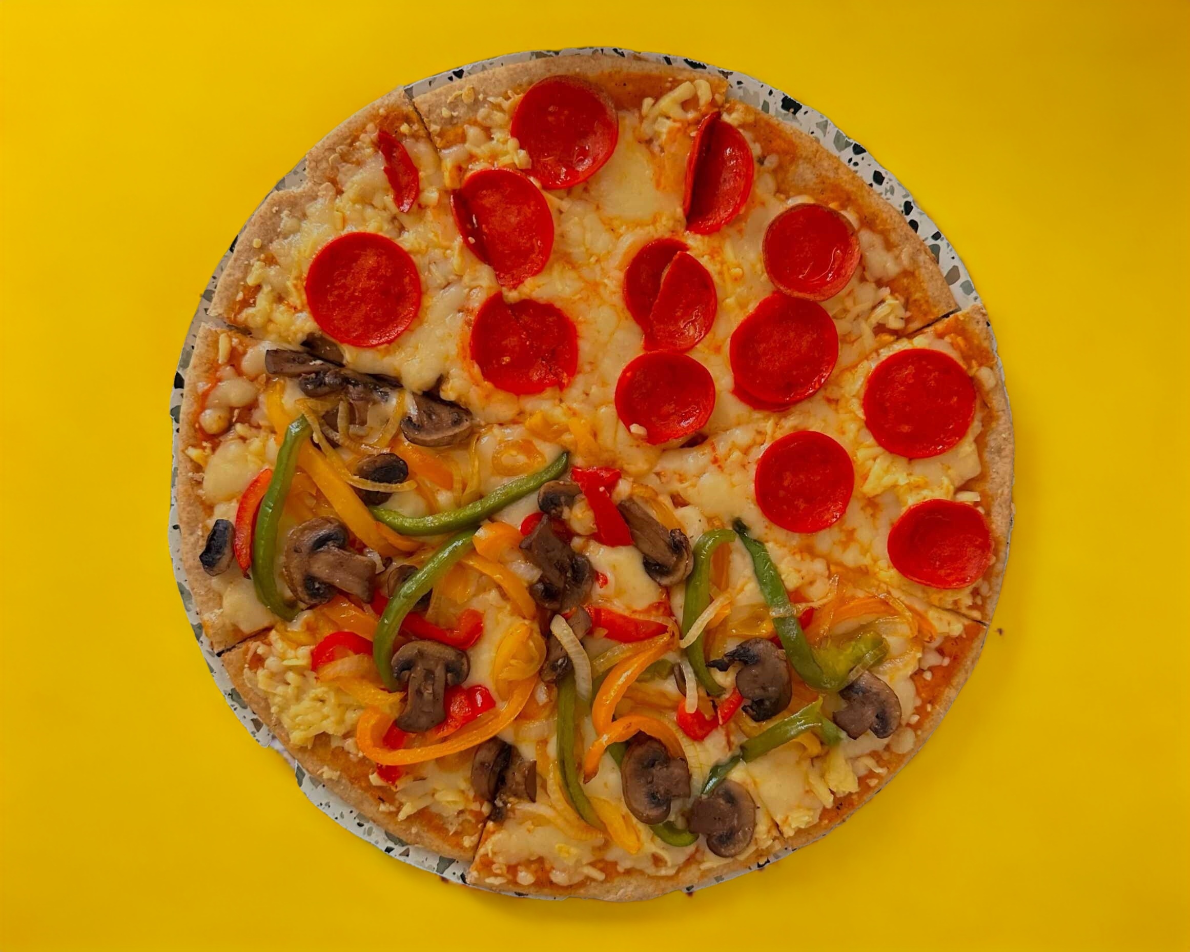Salsa de tomate, manchego, mozarella, pimiento, cebolla, champiy