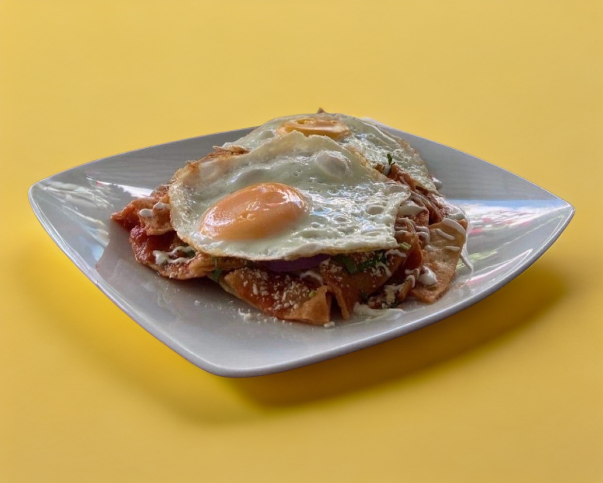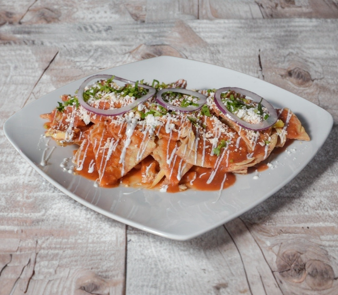 chilaquiles con pollo deshebrado, crema queso y aguacate