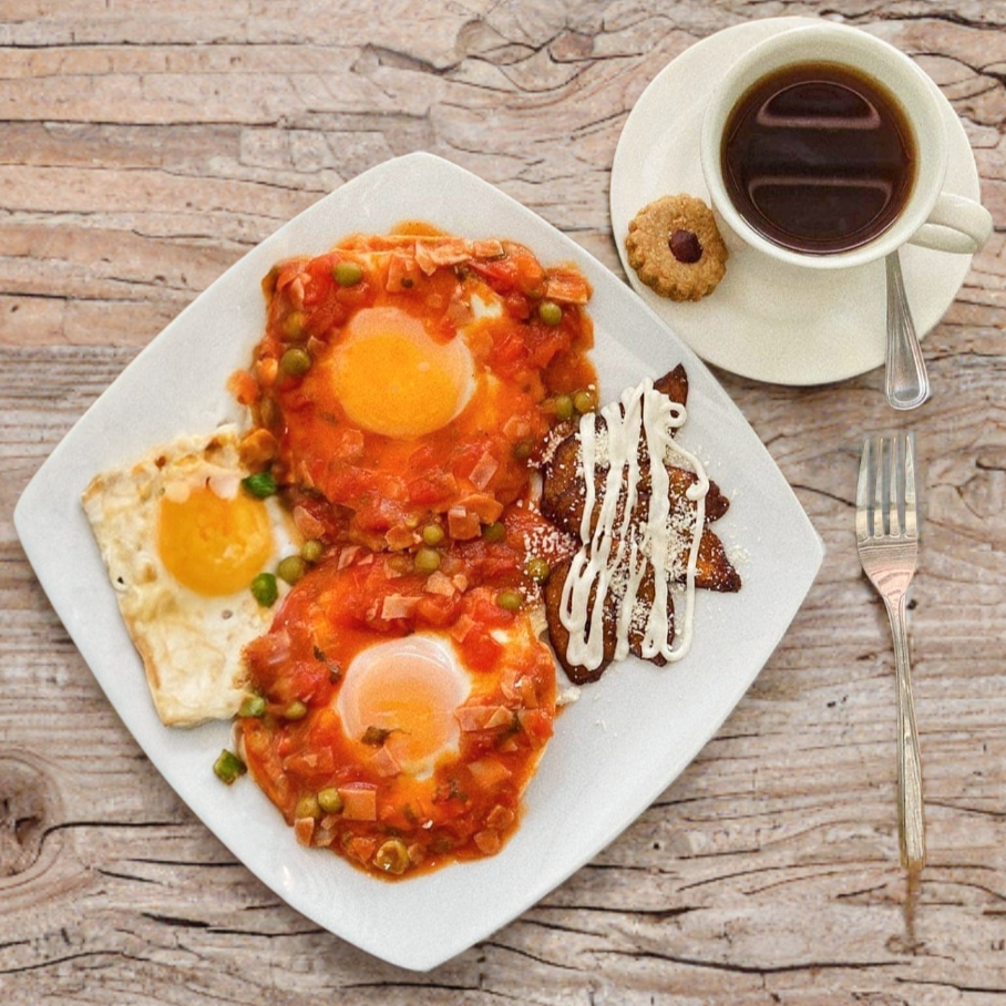 huevos preparados a eleccion, acompañados de frijoles refritos y platanitos friitos