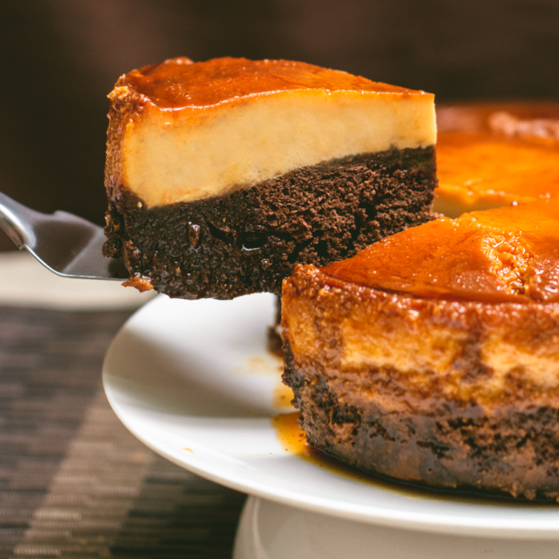 Deliciosa Rebanada de Pastel de Chocolate Combinado con una Capa de Flan
