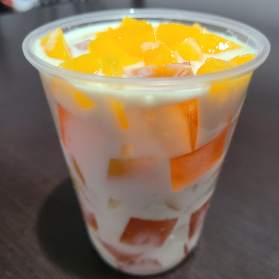 Gelatina de durazno en cubos, durazno picado con crema preparada dulce.