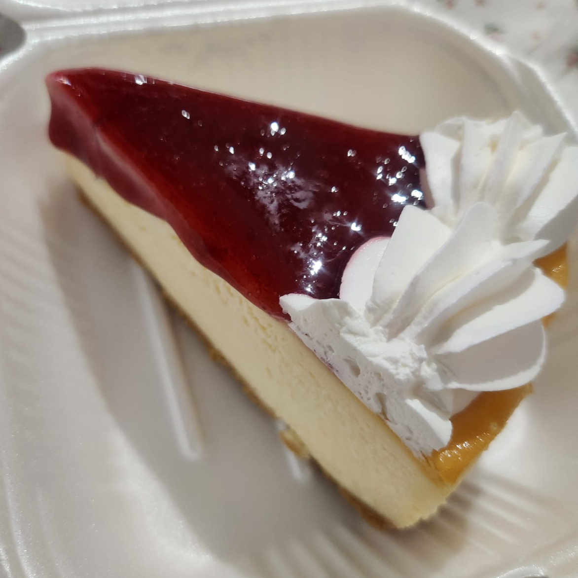 Pastel de Queso cremoso con cobertura de frutos rojos y chantilly.