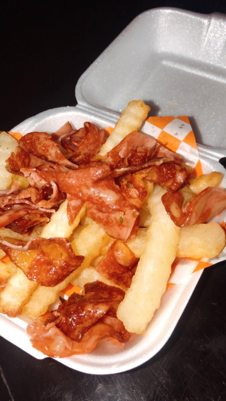 Papas fritas con tocinoqueso de nachos, kétchup.