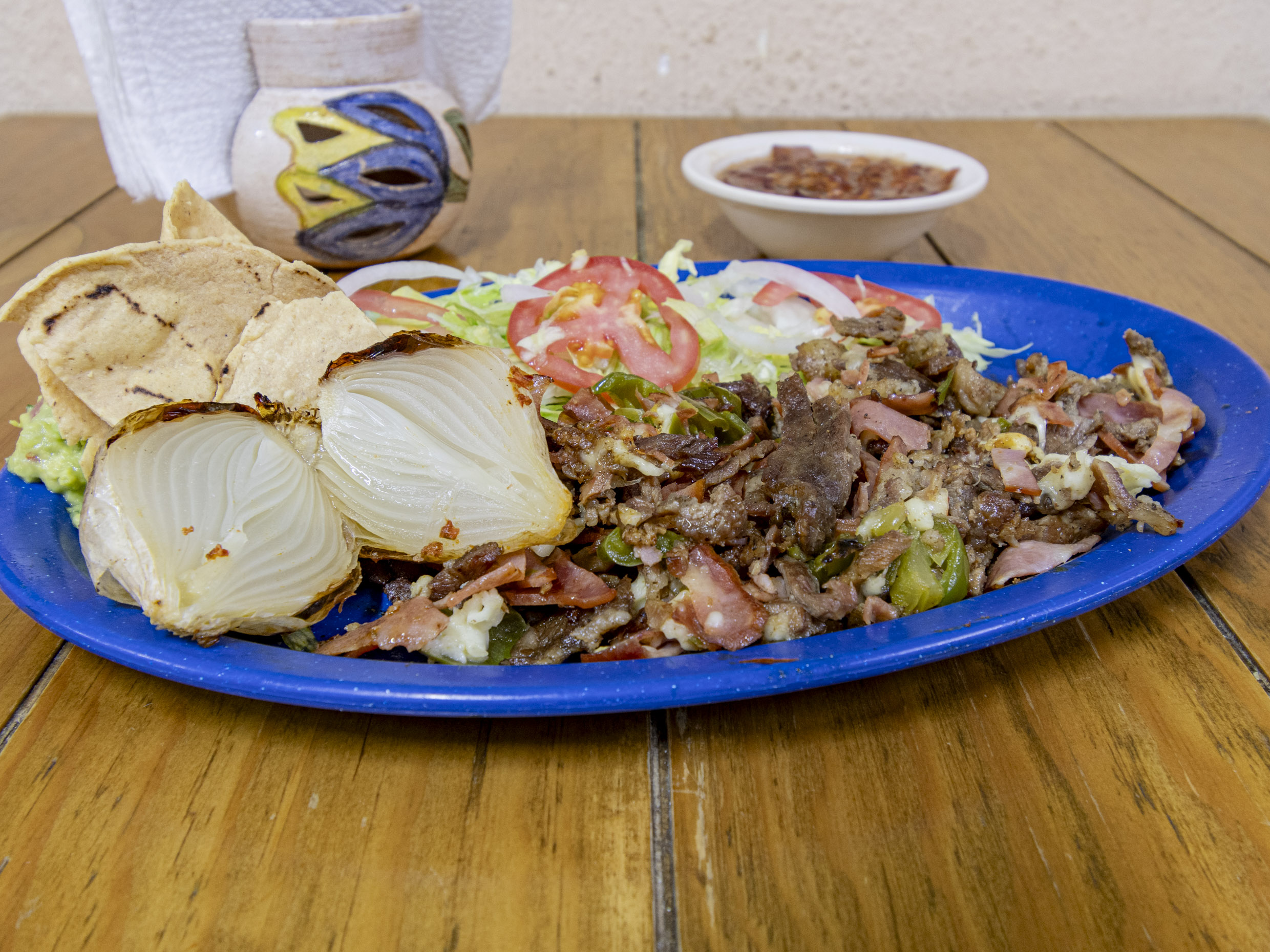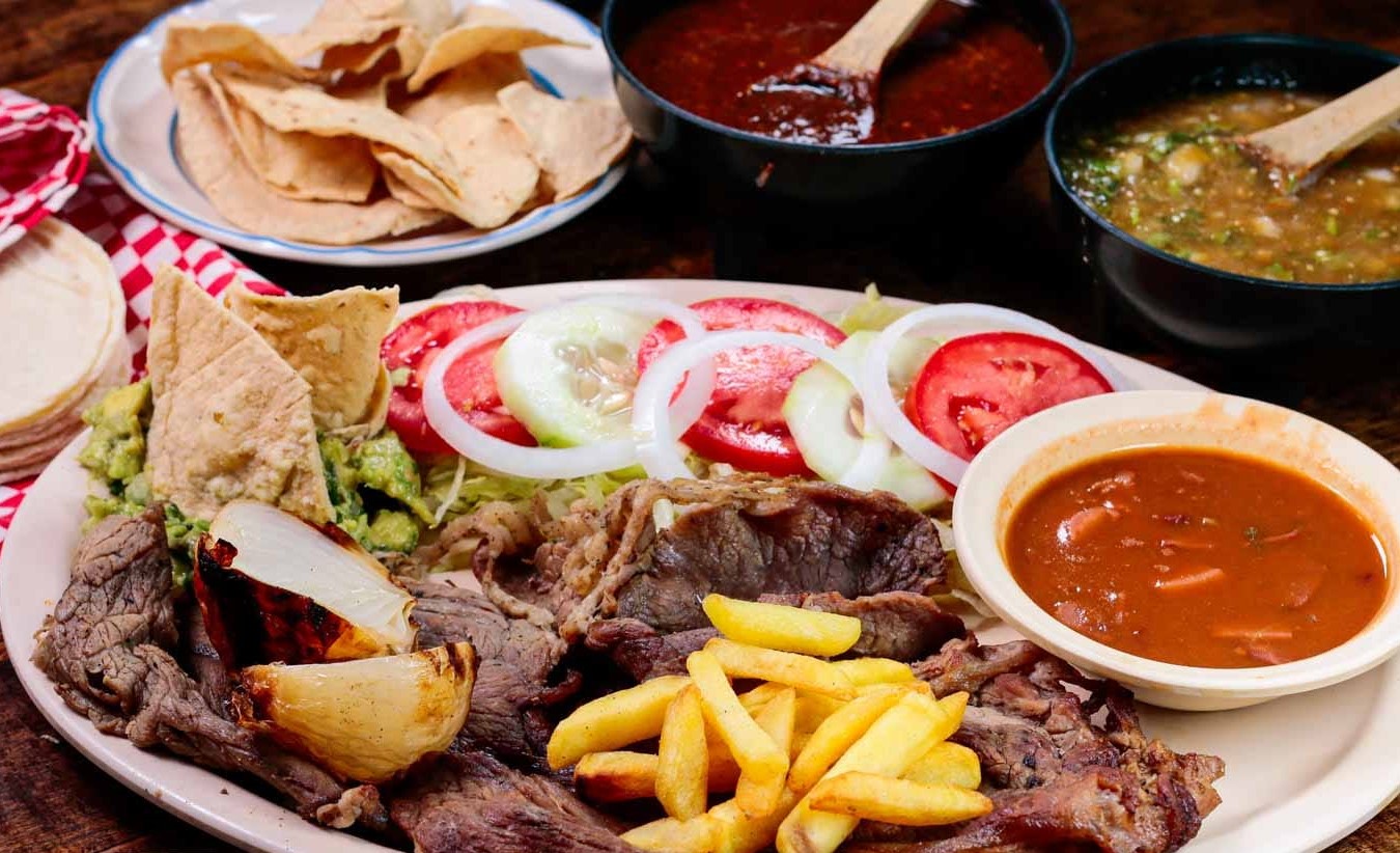 Orden combinada de dos carnes a elegir, acompañado de frijoles charros, ensalada, guacamole, cebolla asada, papas fritas, tortillas y tostadas.