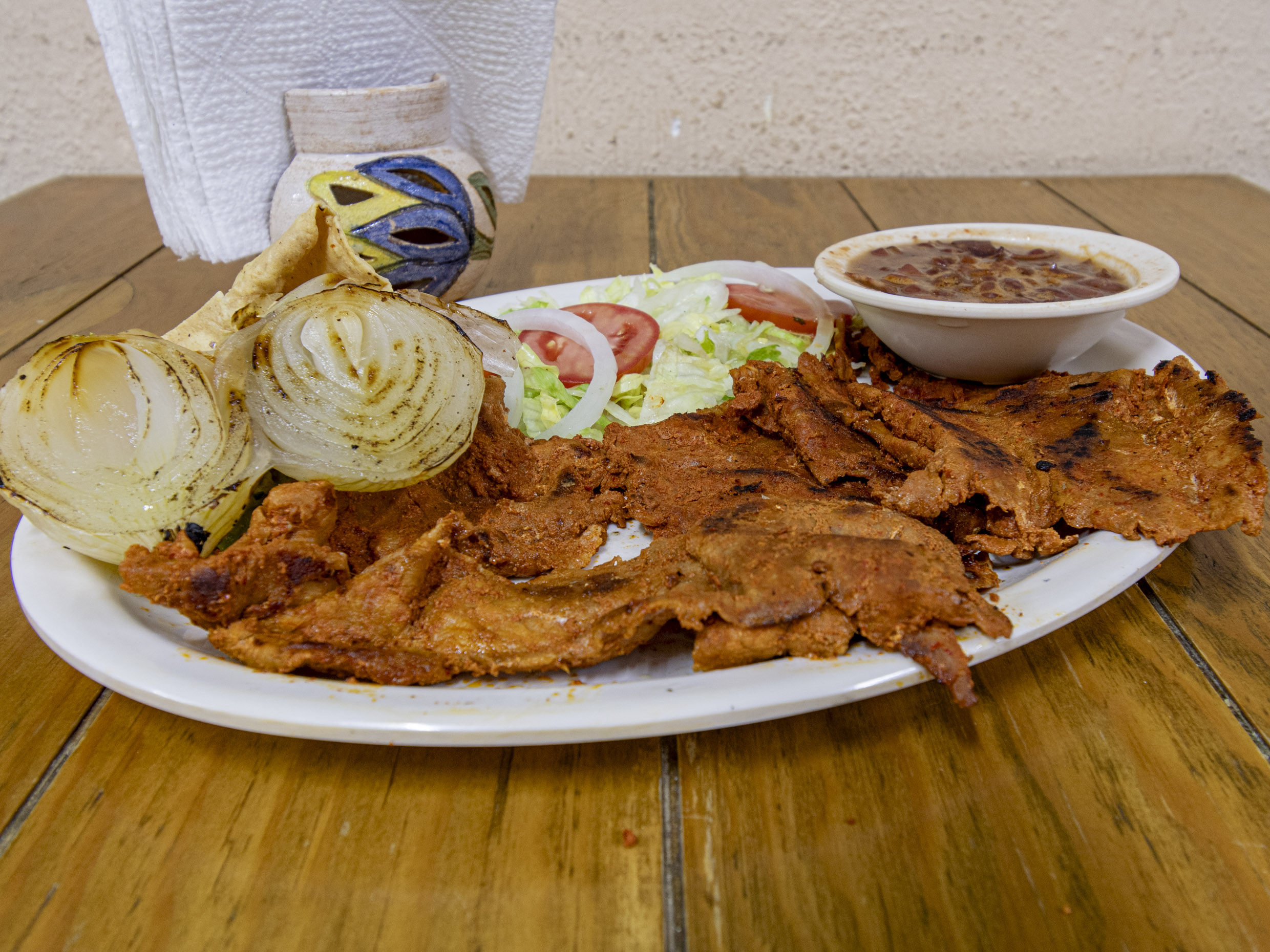 Media orden de carne de Oaxaca (puerco), acompañada de frijoles charros, ensalada, guacamole, cebolla asada, tostadas asadas, tortillas.