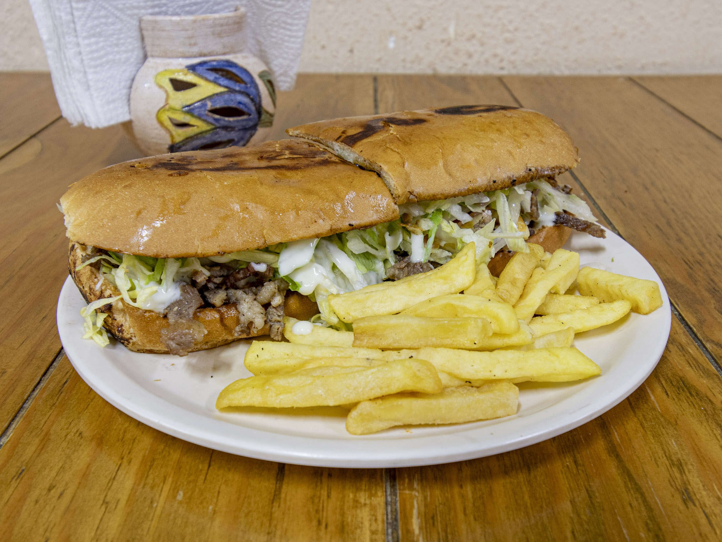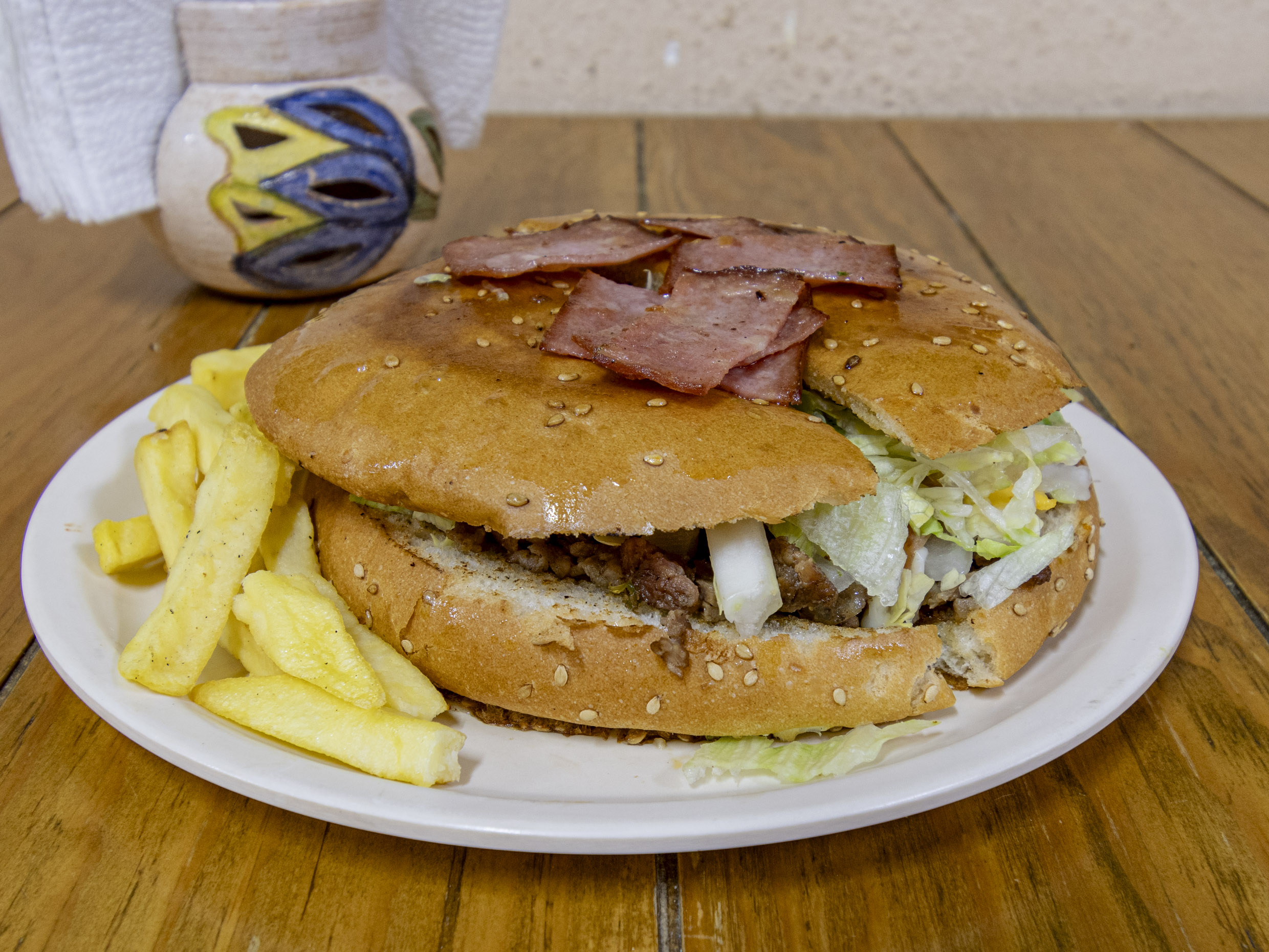 De res, con lechuga, jamón, queso amarillo, queso manchego, tomate, cebolla, picante, tocino acompañada de papas fritas.