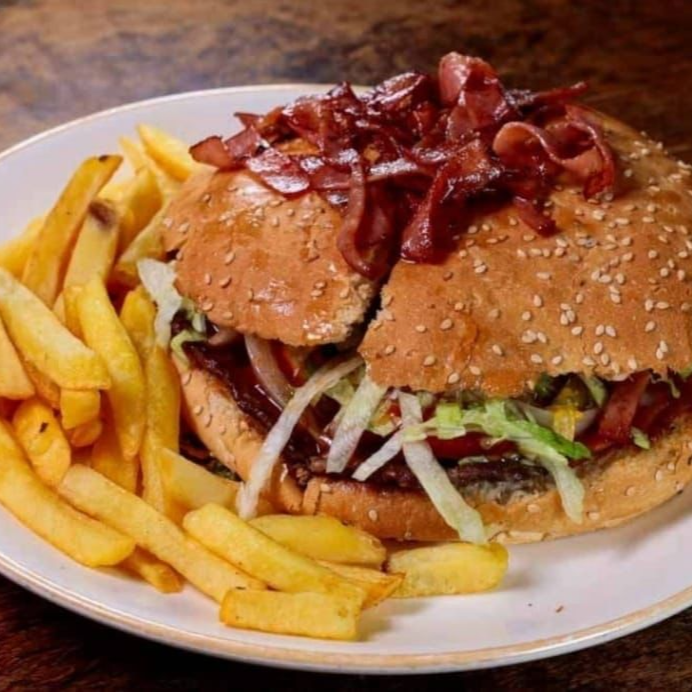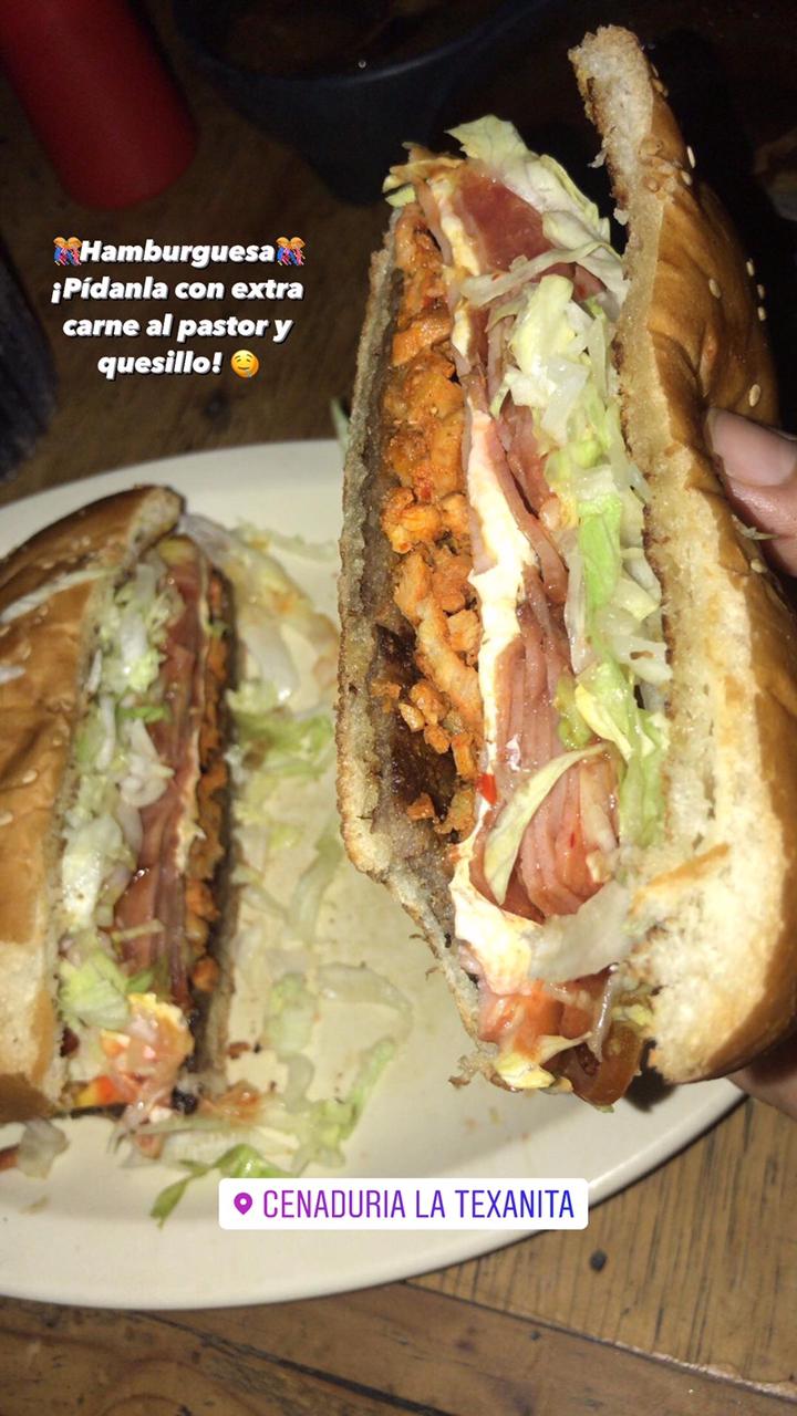 Con carne de pastor,arrachera o asada, con lechuga, jamón, queso amarilllo, queso manchego, cebolla cocida,tomate tocino acompañada de papas fritas. En comentarios colocar la carne de su hamburguesa