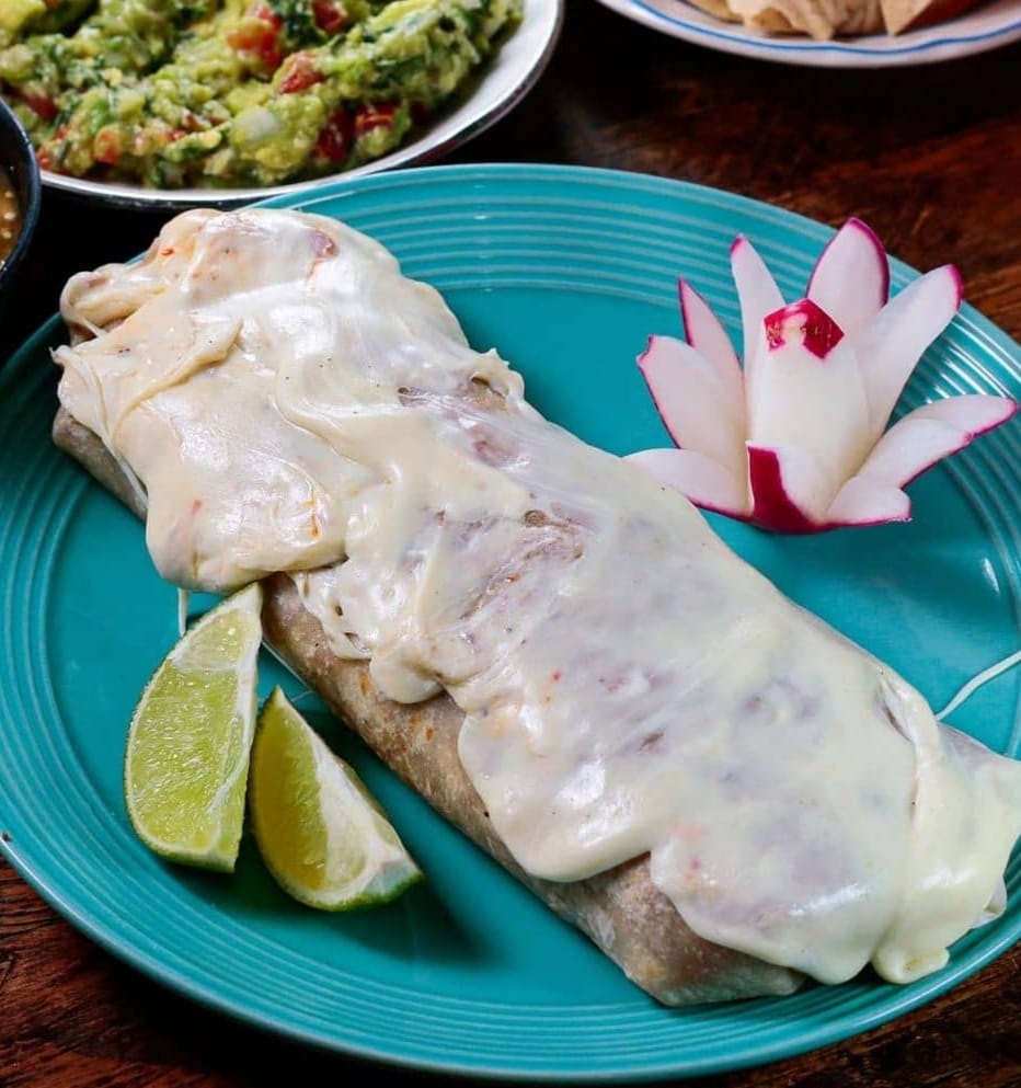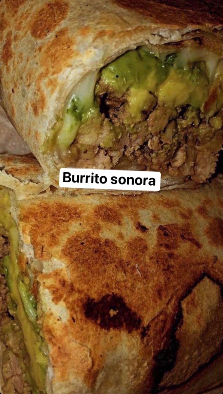 Burrito gigante detortilla de harina, dos tipos de carne a elegir, frijoles charros, lechuga, guacamole, crema y quesillo fundido encima.g