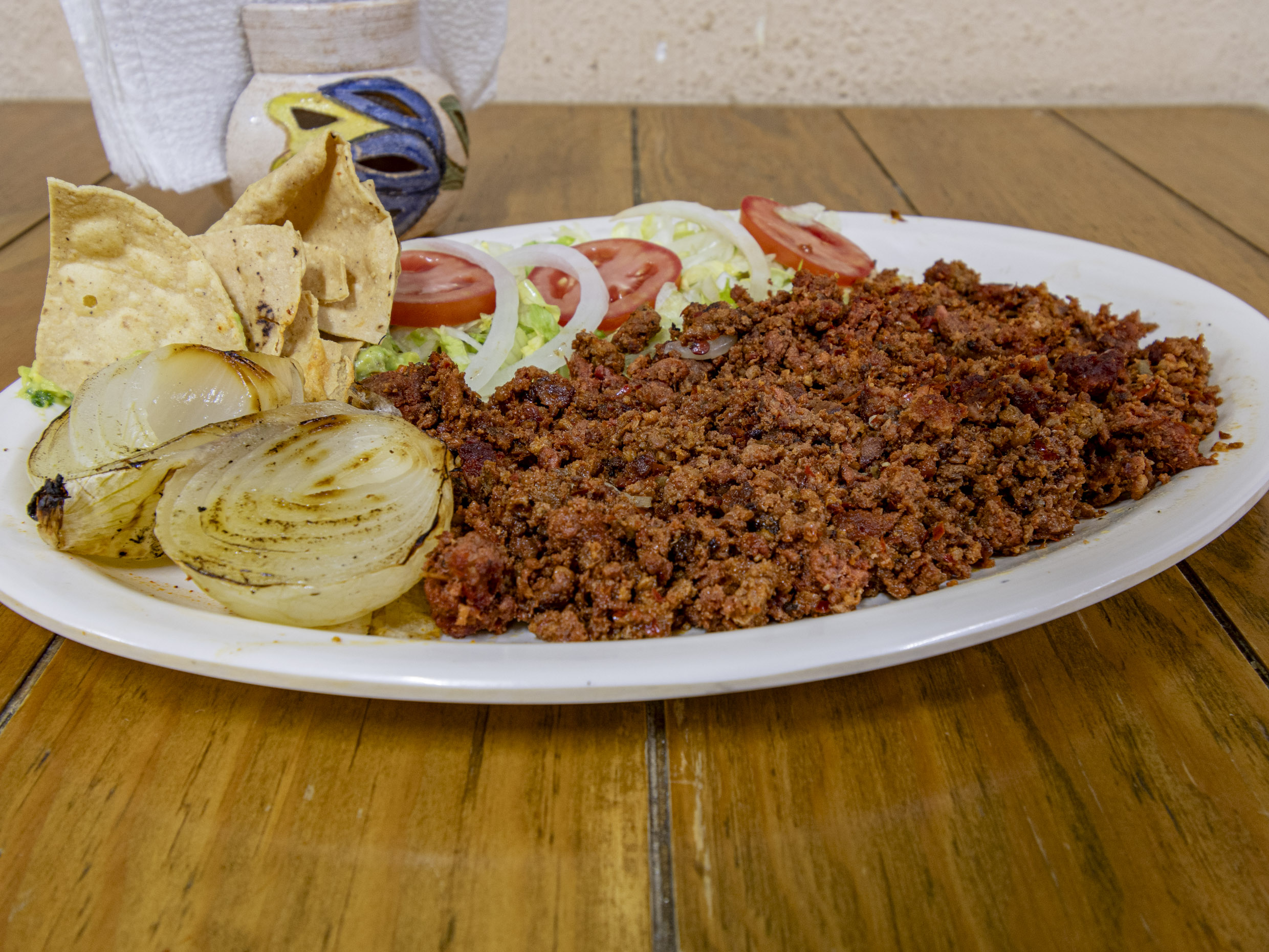 Consiste en carne asada con chile morrón, tocino y quesillo fundido, acompañado de frijoles charros, ensalada, guacamole, cebolla asada, papas.