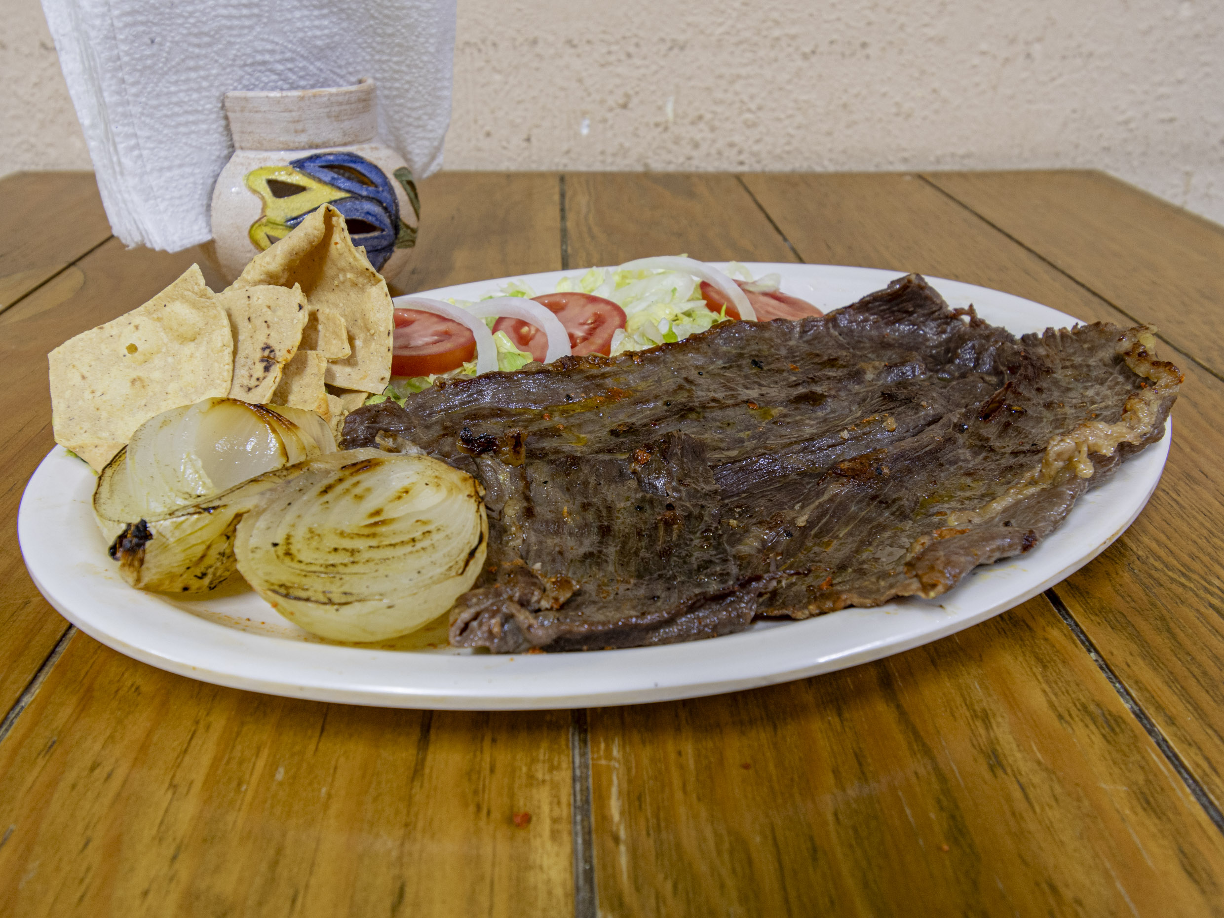 Media orden de carne (asada con tocino chile morrón y quesilo fundido) acompañada de frijoles charros, ensalada, guacamole, cebolla asada, papas fritas, tortillas.