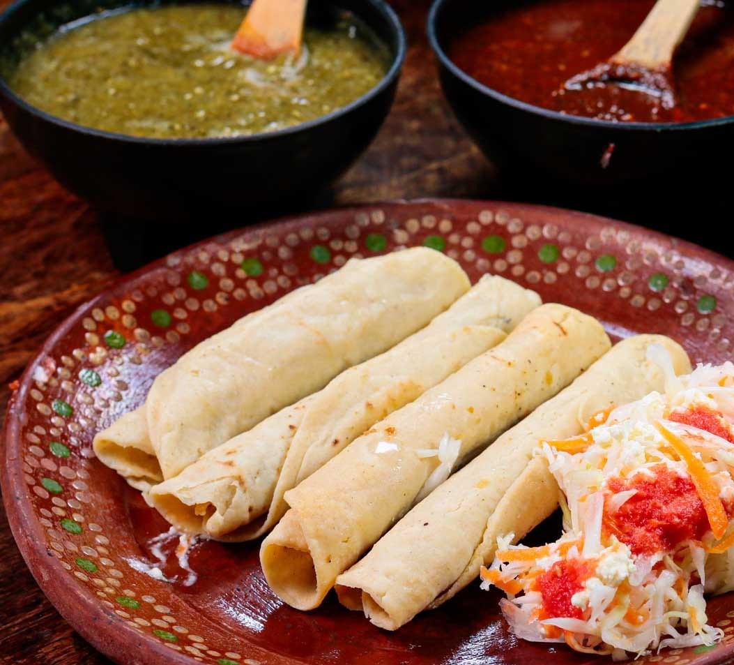 Orden de 4 piezas medianas de tacos fritos de pollo con papa acompañados de repollo, salsa, queso y chiles jalapeños.