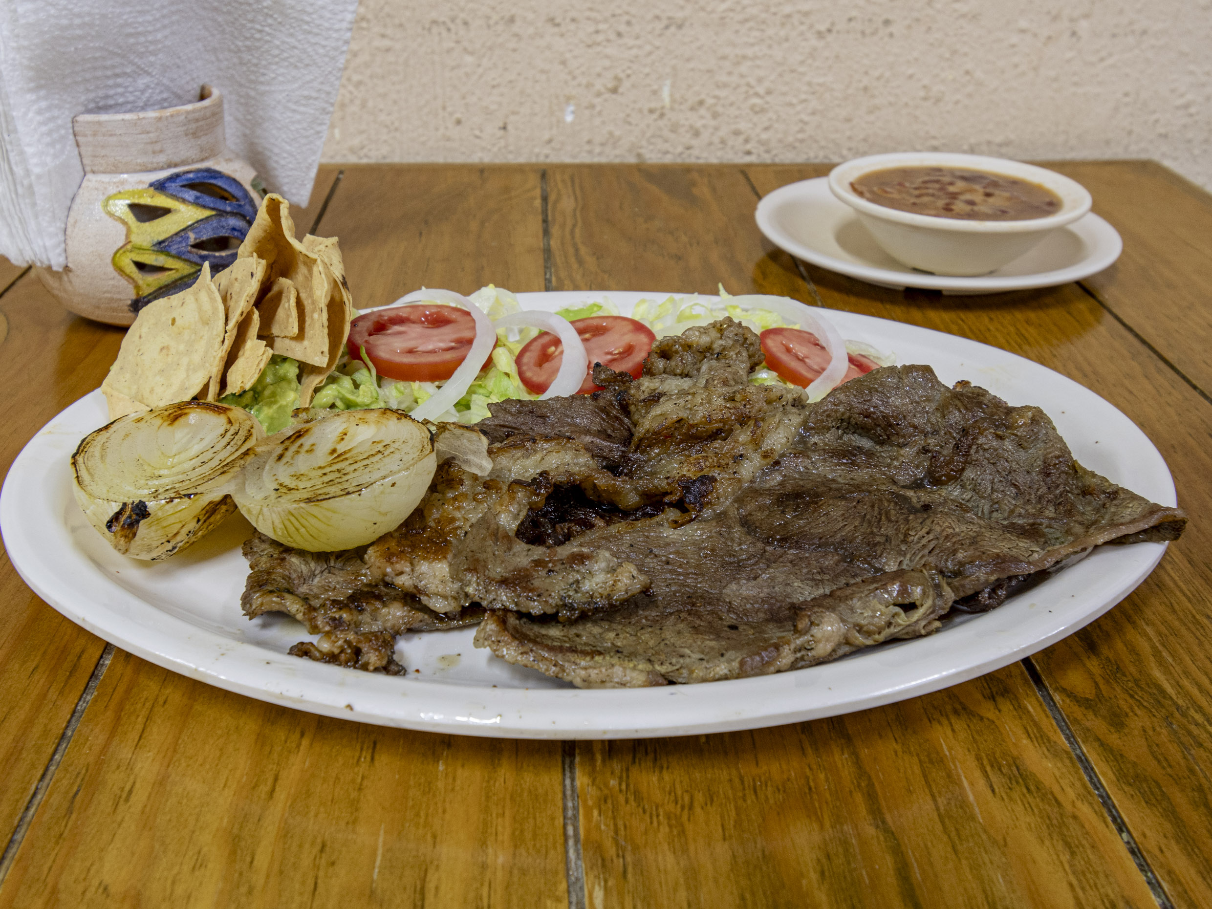 Carne de res acompañada de frijoles charros, ensalada , guacamole, cebolla asada, papas fritas, tortillas y tostadas.