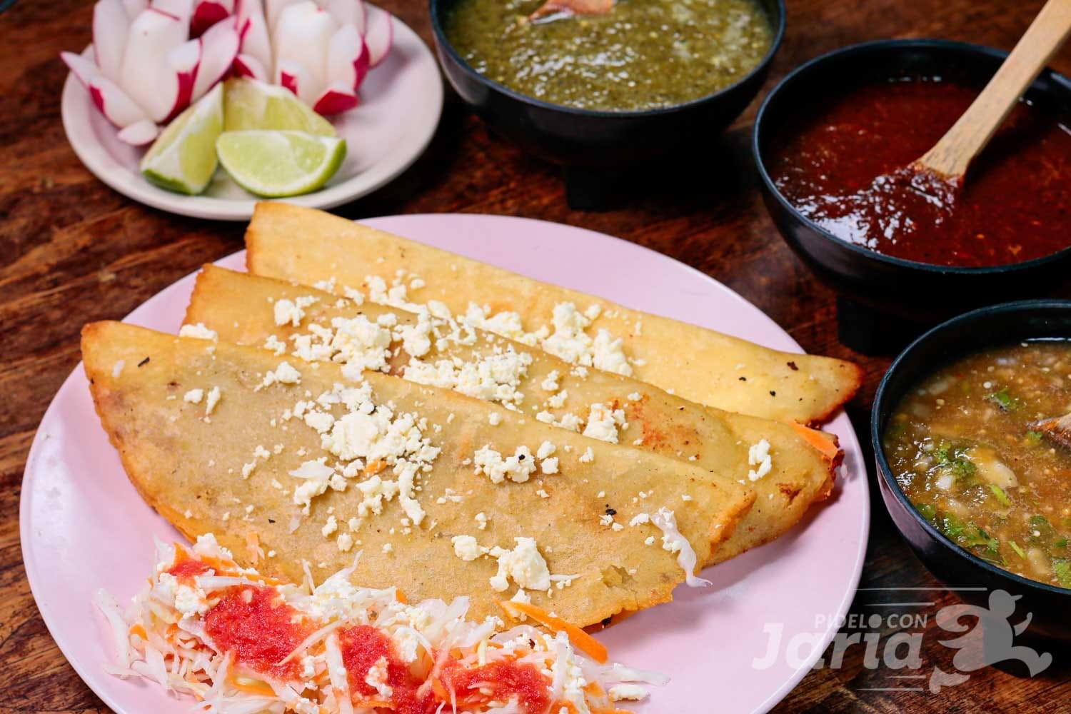 3 Piezas de garnachas medianas acompañadas de repollo, queso y salsa.