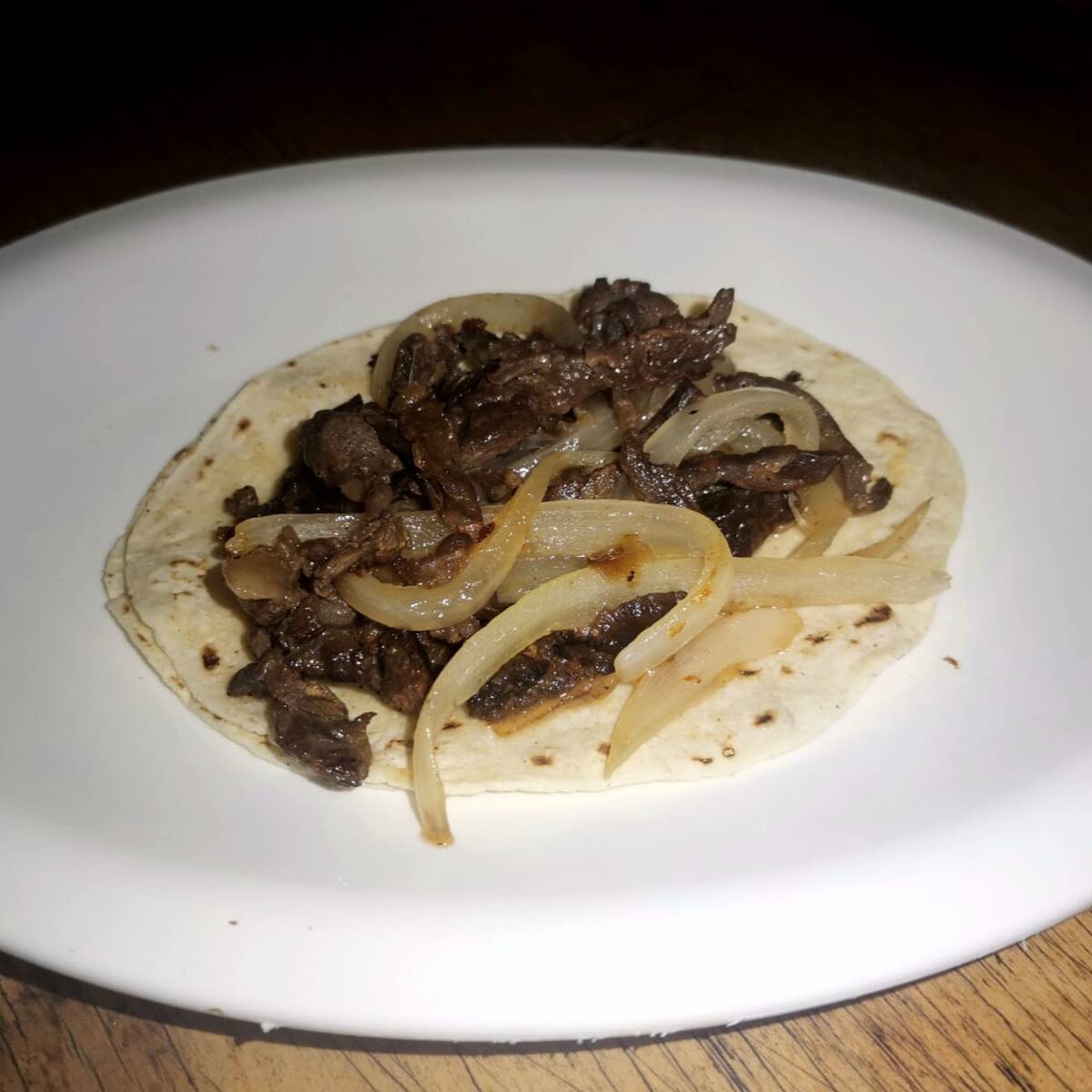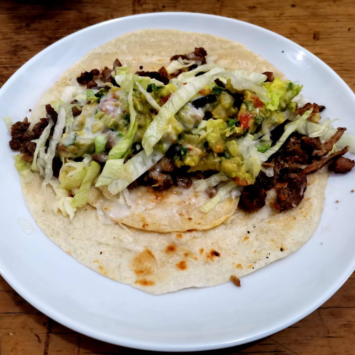 Taco grande de doble tortilla, una de harina y una de maíz, un poco frita, carne de arrachera, lechuga, crema.