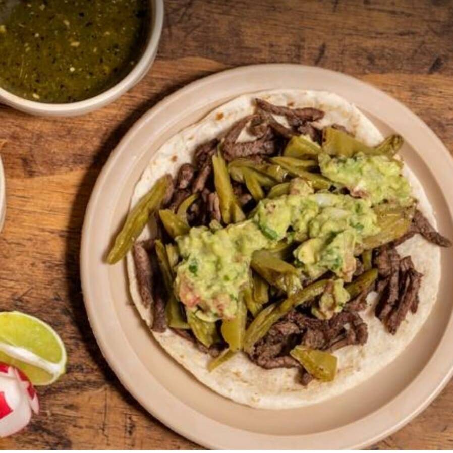 Taco grande tortilla de harina con carne asada, nopales y guacamole.