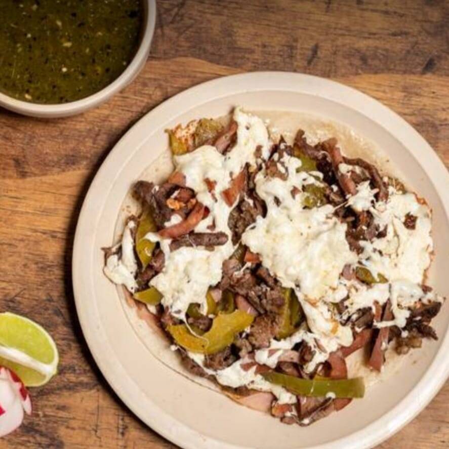 De gigante de harina con carne de asada, pastor y chorizo con queso manchego, quesillo aguacate cebolla