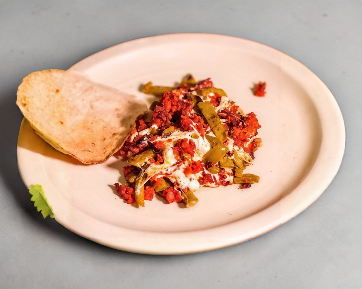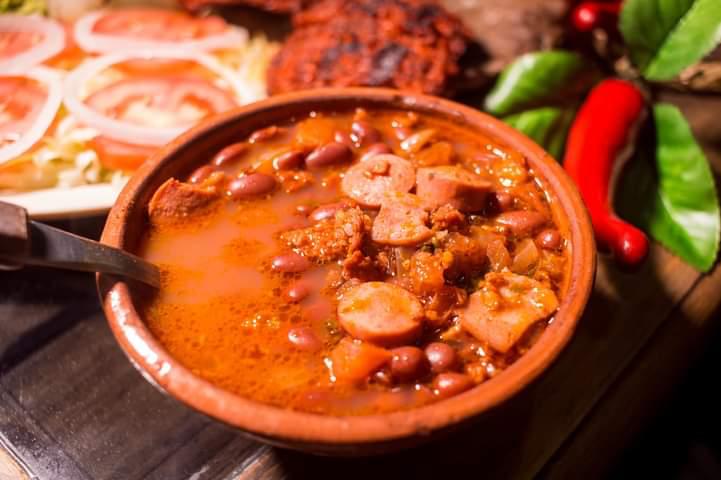 Lleva frijoles, chorizo, salchicha, tocino, chicharrón, picante (poco).