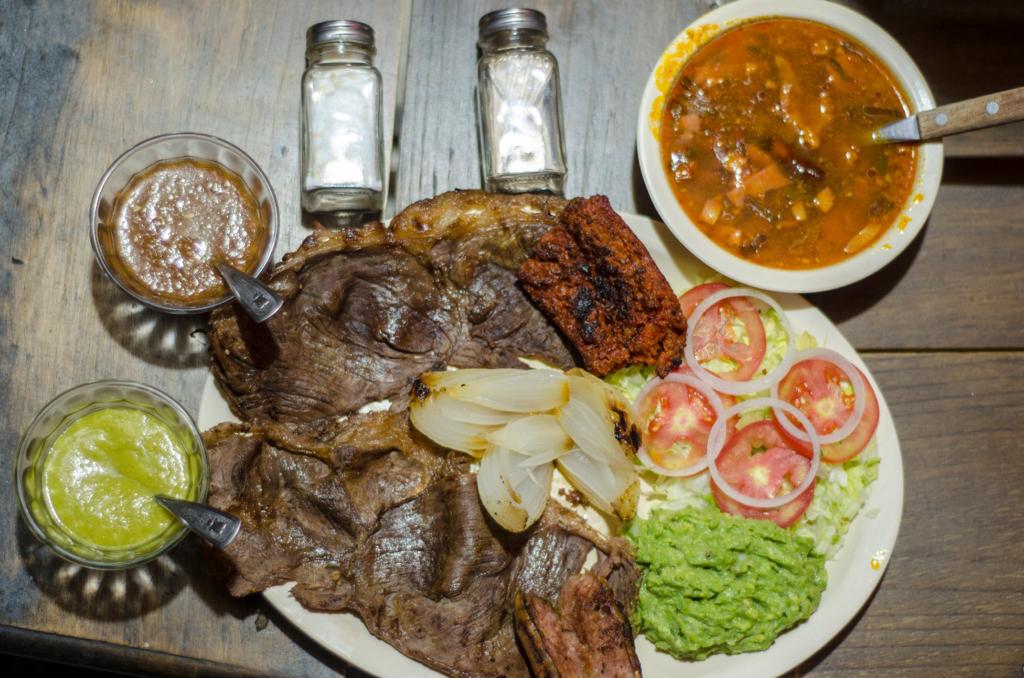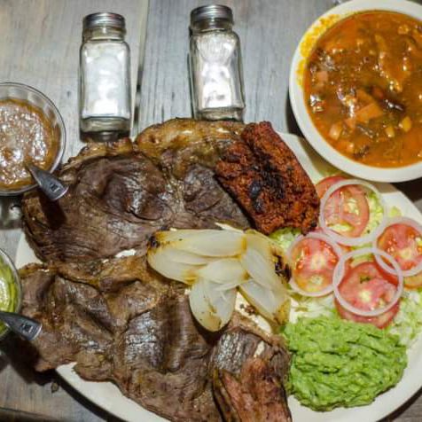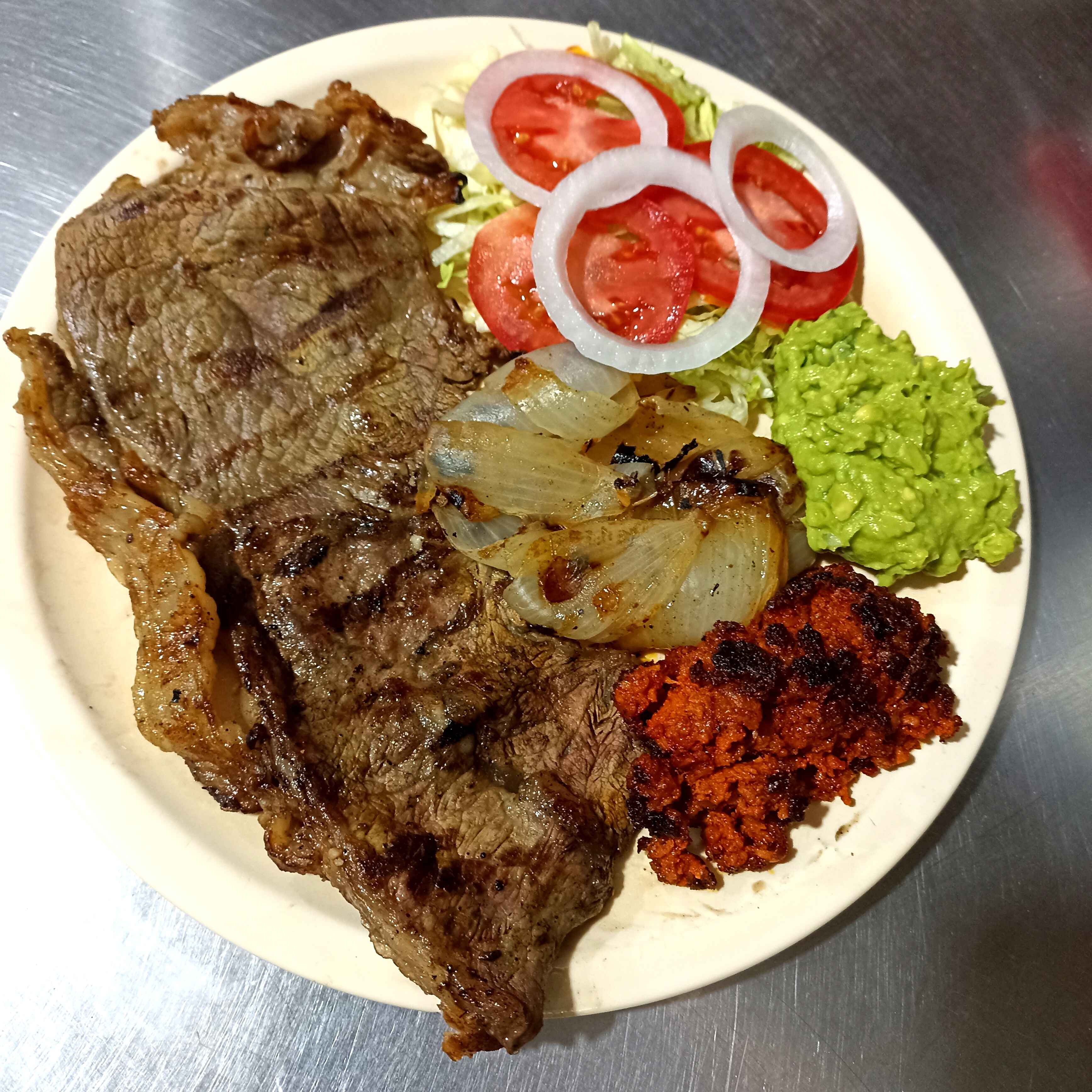200 g Un bistec, chorizo, ensalada, cebolla asada y guacamole (para una persona).