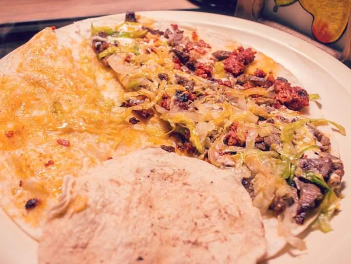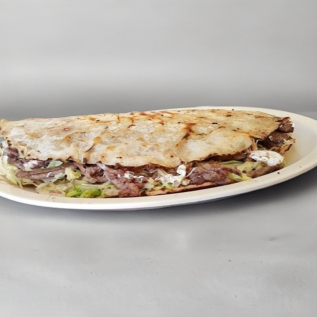Tortilla de harina, quesillo o queso manchego, carne asada, chorizo y lechuga.