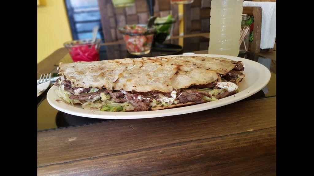 Tortilla grande, asiento de manteca, frijol, lechuga, quesillo, carne asada o chorizo, mixta asada y chorizo.