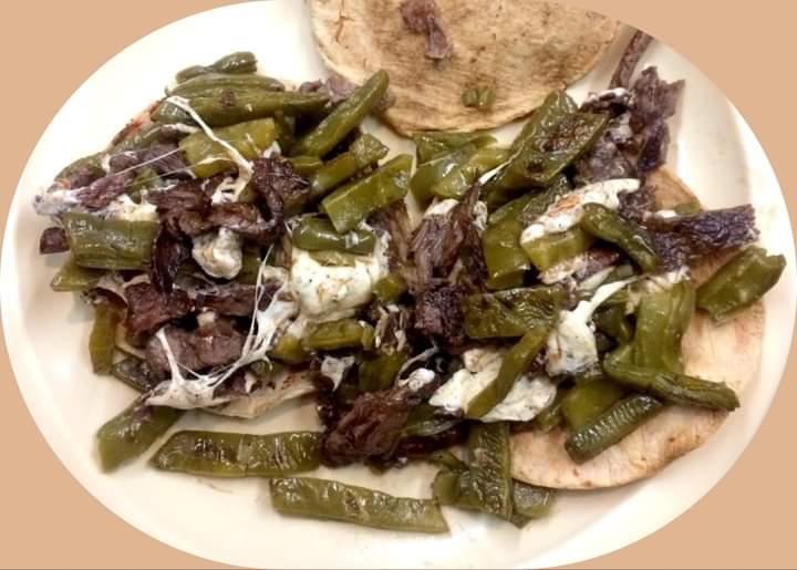 Carne asada, chile pimiento, tocino, y quesillo (3 tortillas de harina).