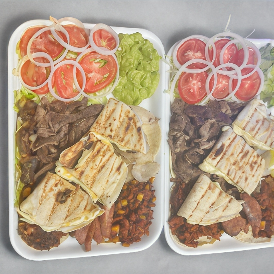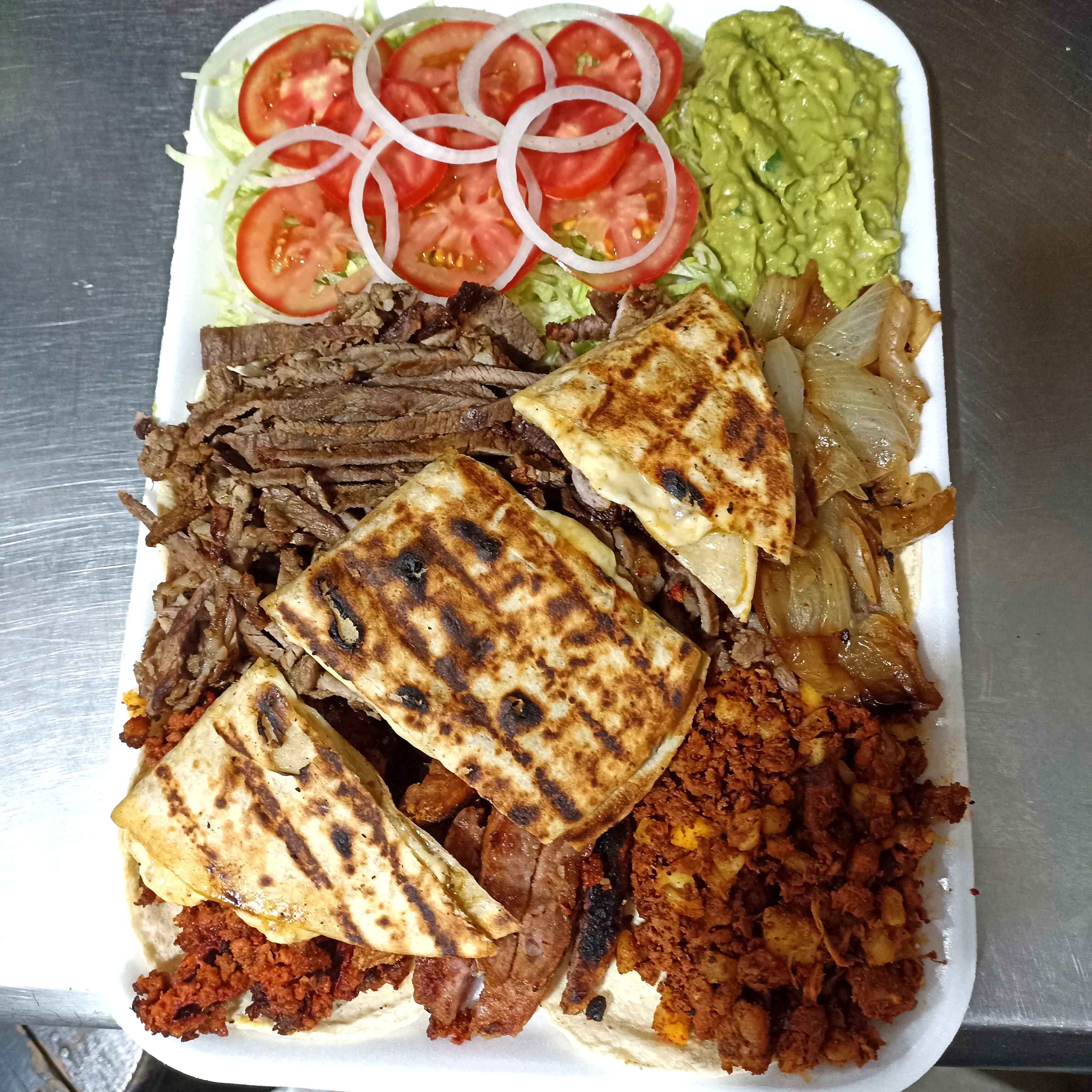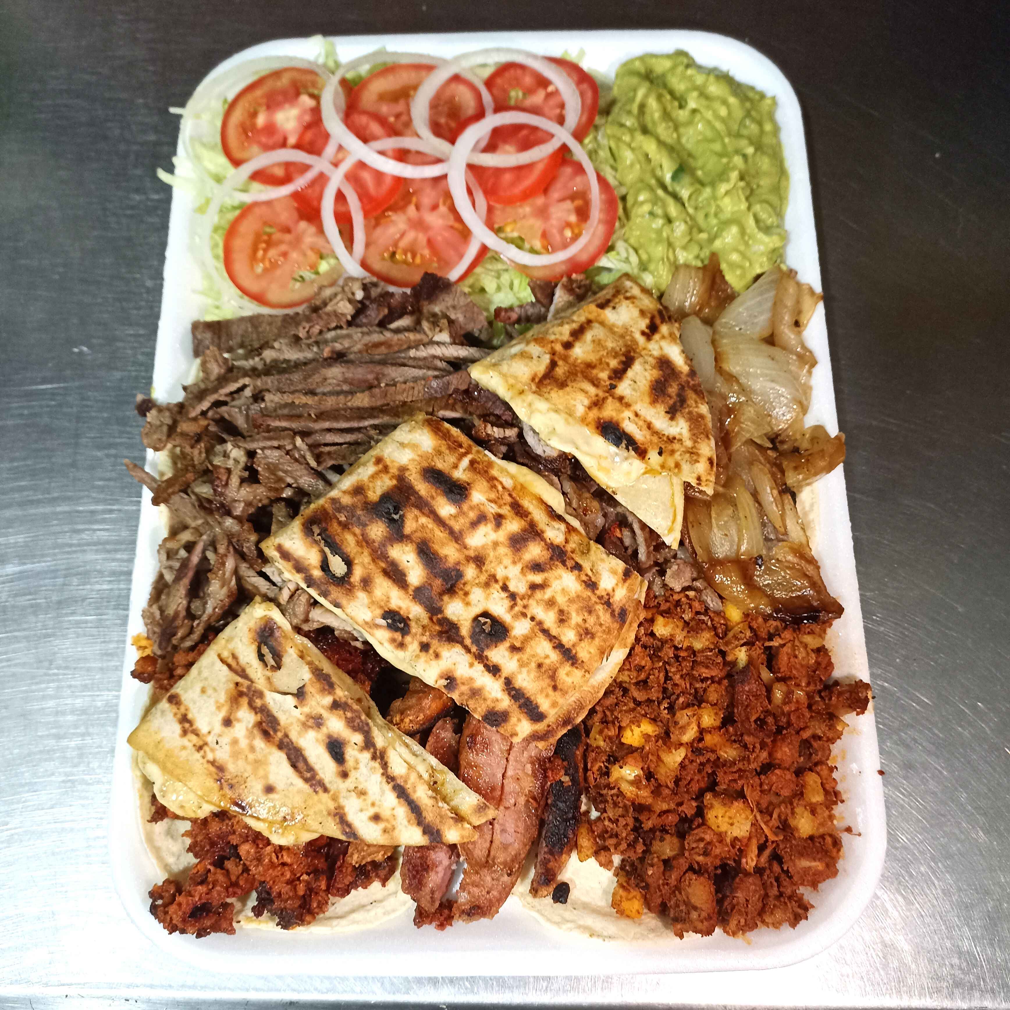 Bistec, chorizo, pastor, ensalada, cebolla asada y guacamole.