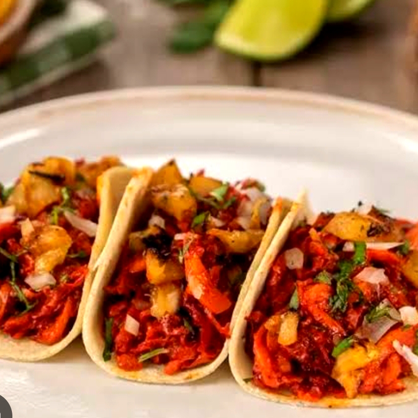 Tortilla, carne al pastor, piña, acompañado de salsas.