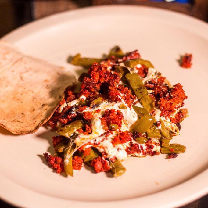 Tostada con chorizo, quesillo y nopal.