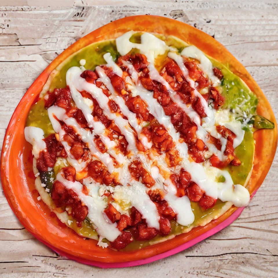 Huarache con salsa de tu preferencia y un guiso de tu elección.