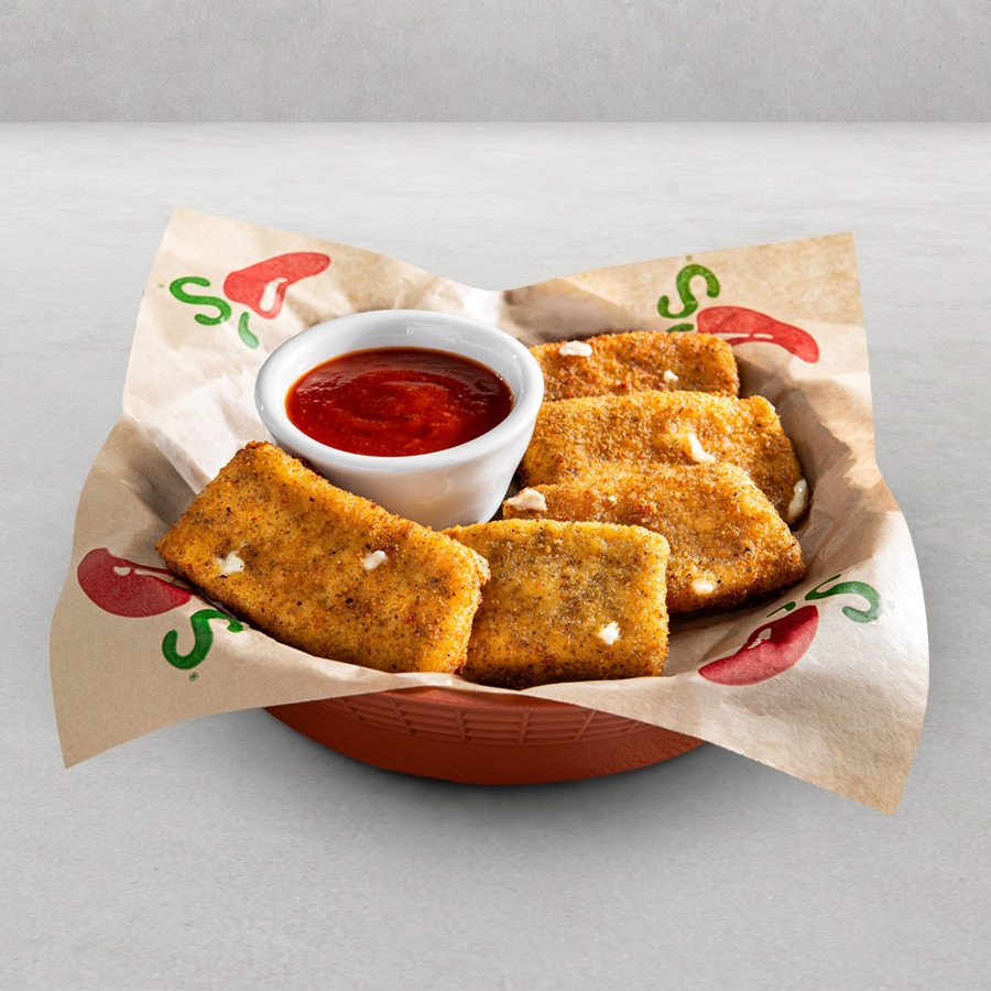 5 barras de queso mozzarella fritas servidas con salsa Marinara.