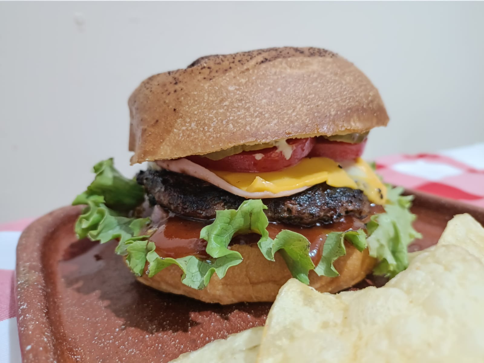 150 Grs de carne, mayonesa, mostaza, cátsup, mezcla de quesos, jamón, lechuga, cebolla caramelizada, pepinillos, salsa bbq y tomate.