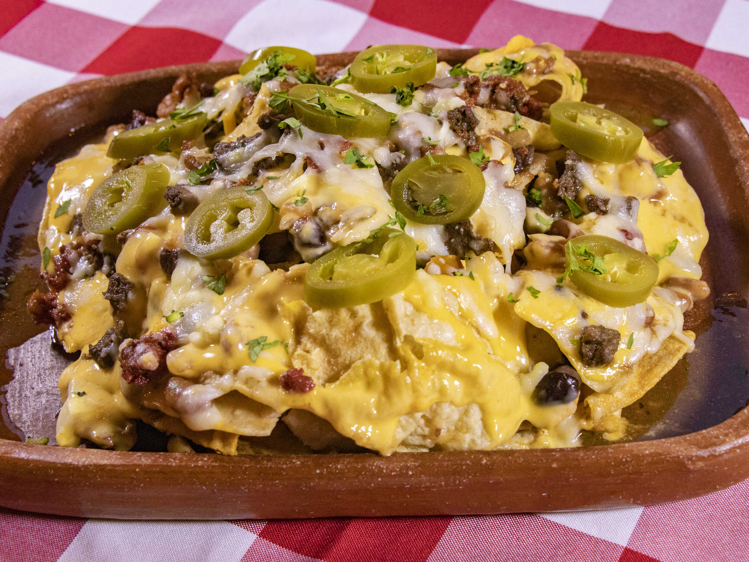 Tortillas de maíz fritas acompañadas con aderezo de nachos, frijoles, salsade tomate, arrachera, chorizo, chistorra y chiles jalapeños. Gratinados con mezcla de quesos.