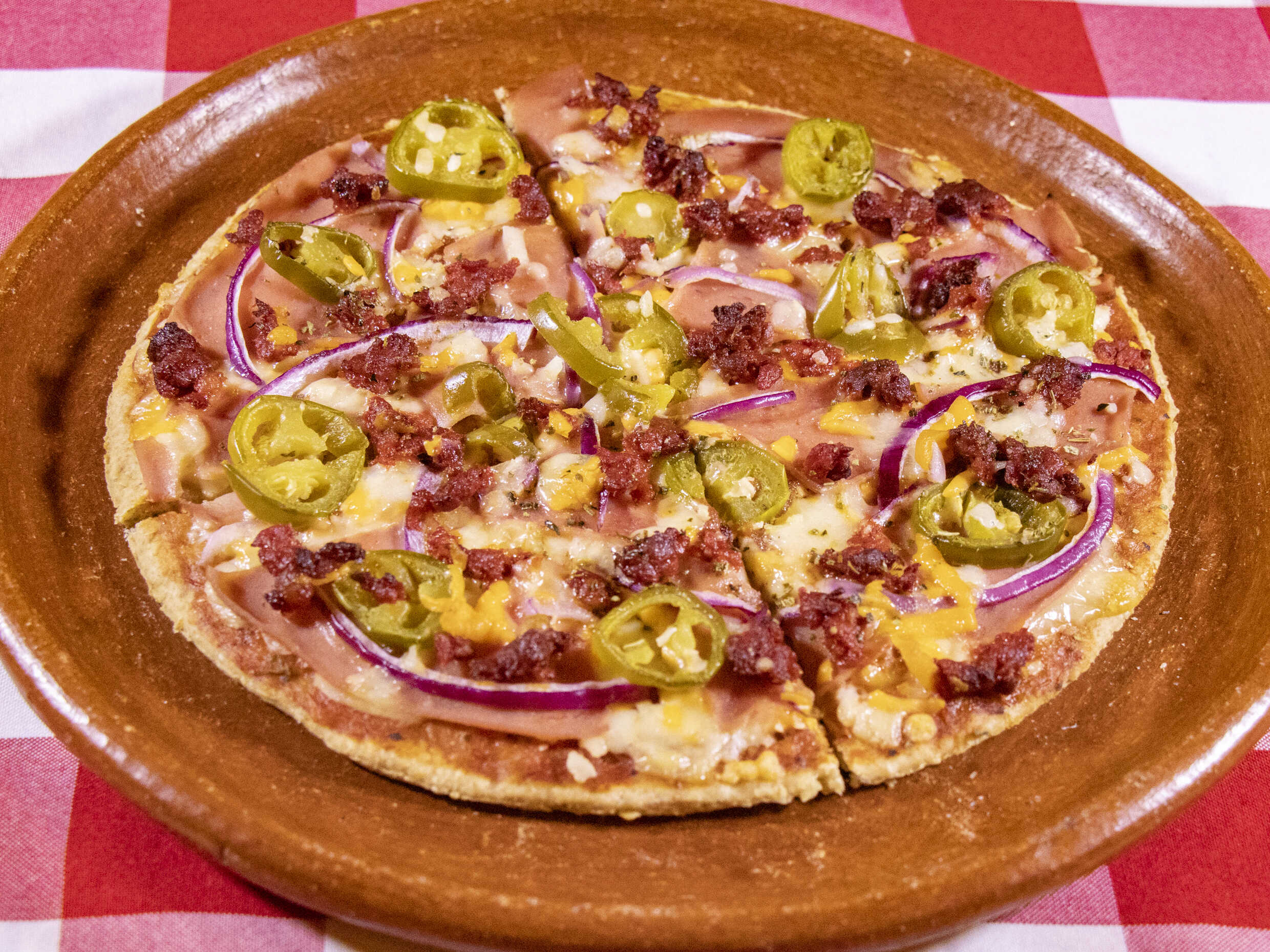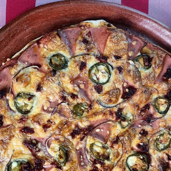 Base de avena con harina integral 23 cms aproximadamente, mezcla de quesos, salsa de tomate italiano, chorizo español, jamón, cebolla morada y chiles jalapeños.