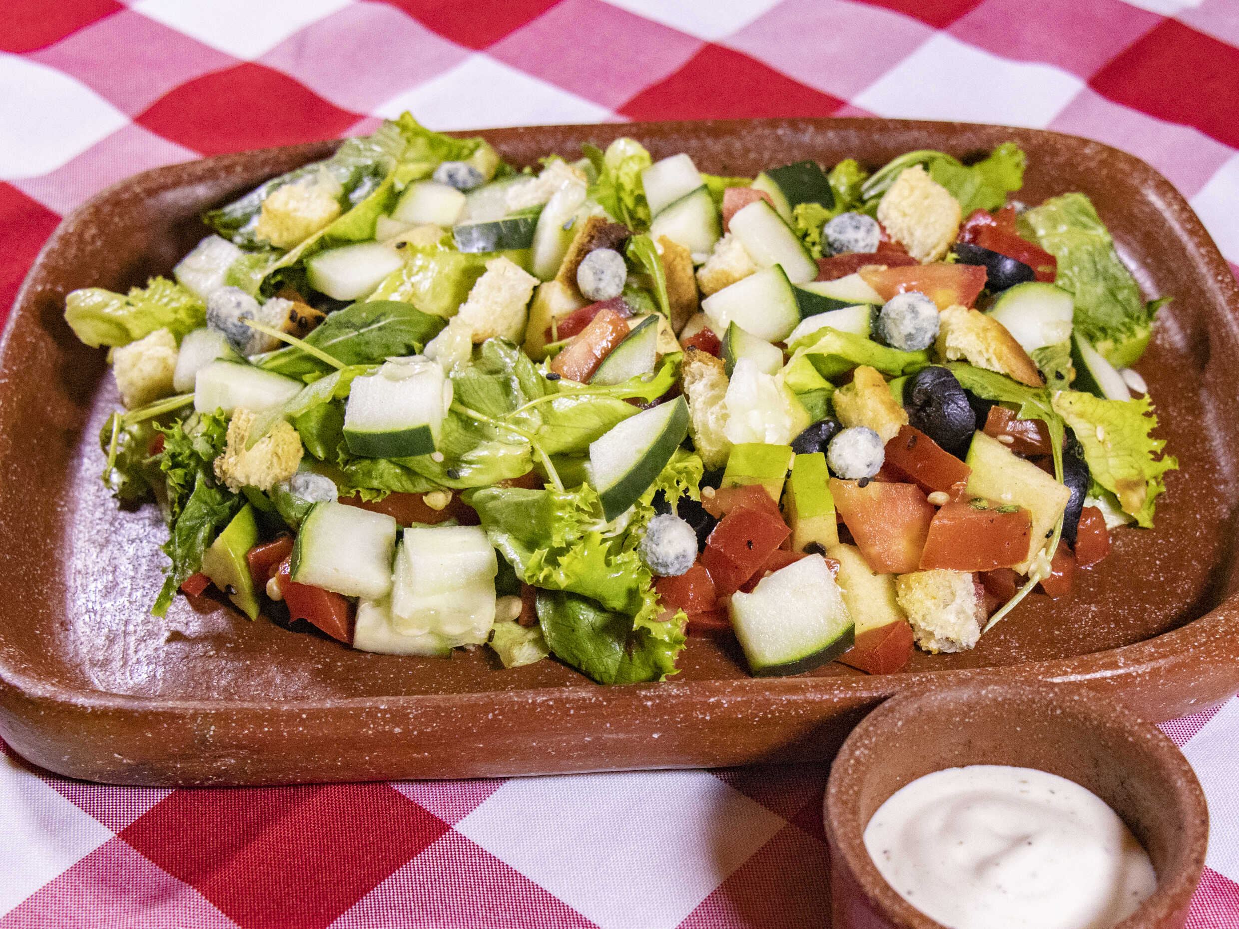 Lechuga italiana, arúgula, espinaca, tomate, pepino, manzana verde, aceitunas negras, pimiento, ajonjolí, semilla de girasol, queso parmesano, crutones y aderezo ranch.