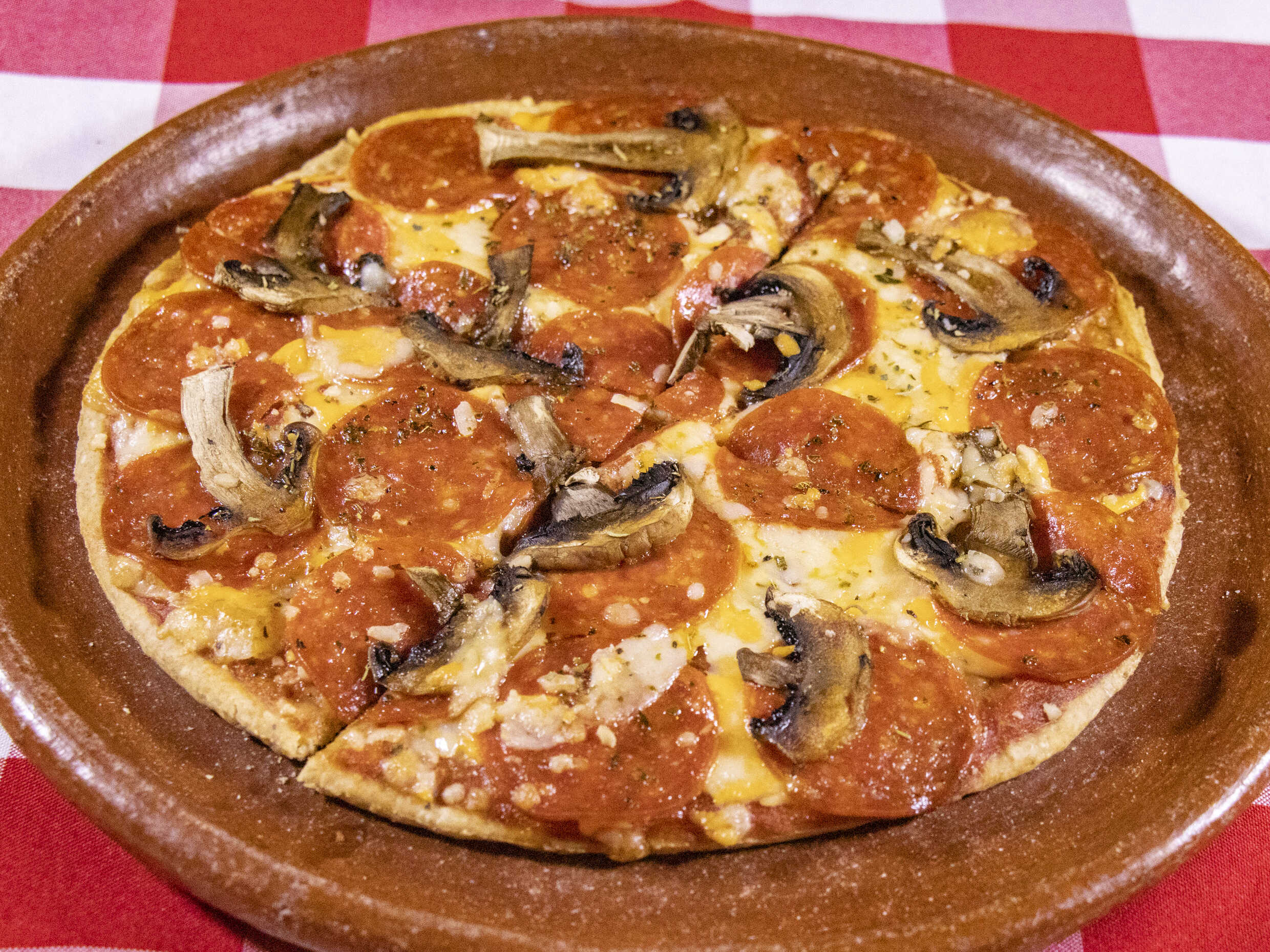 Base de avena con harina integral 23 cms aproximadamente, mezcla de quesos, salsa de tomate italiano, champiñones naturales y pepperoni.