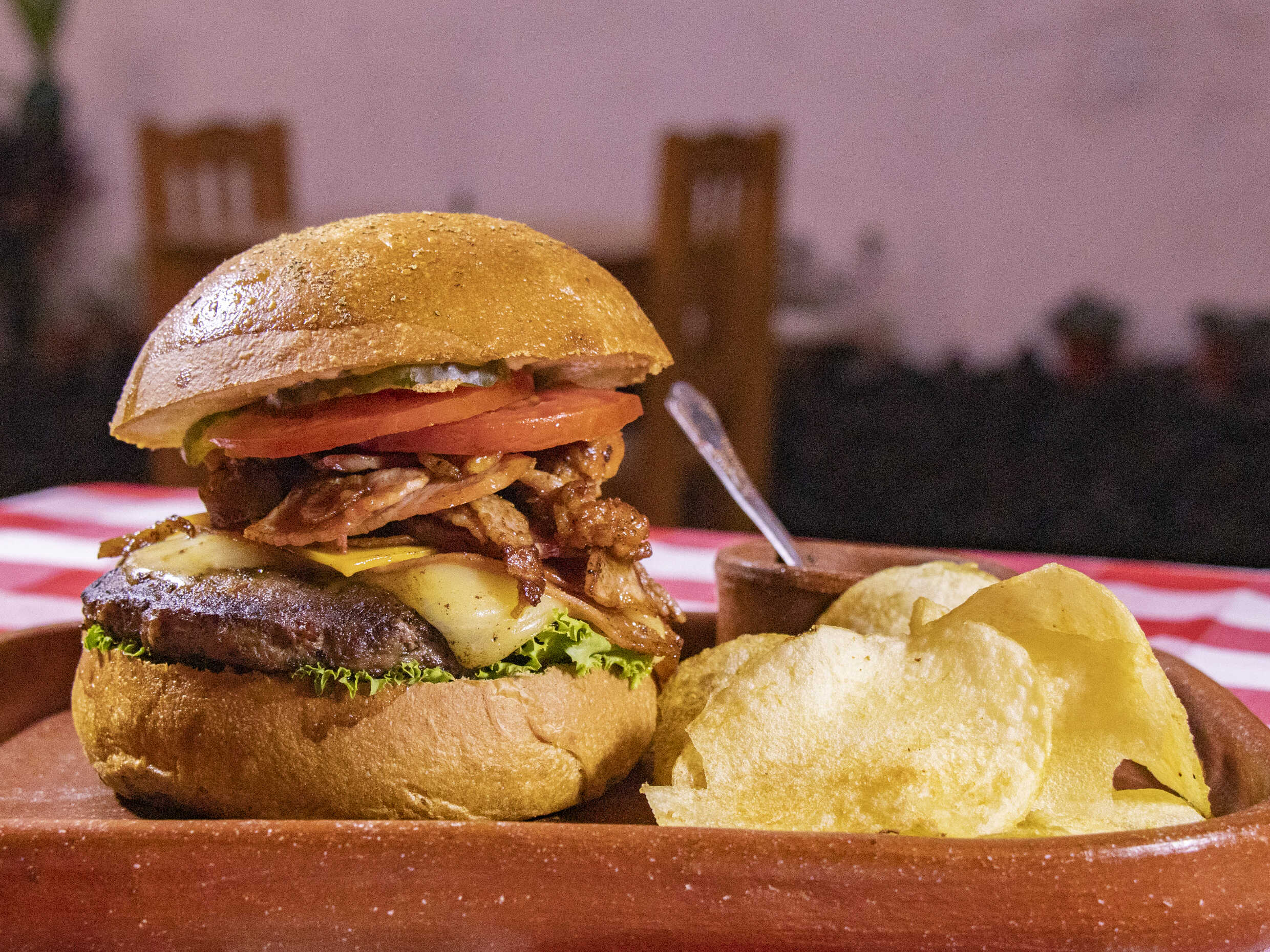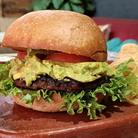 Pan artesanal, 150gr de carne, mezcla de quesos, jamón, lechuga, cebolla, pepinillos, guacamole y tomate.