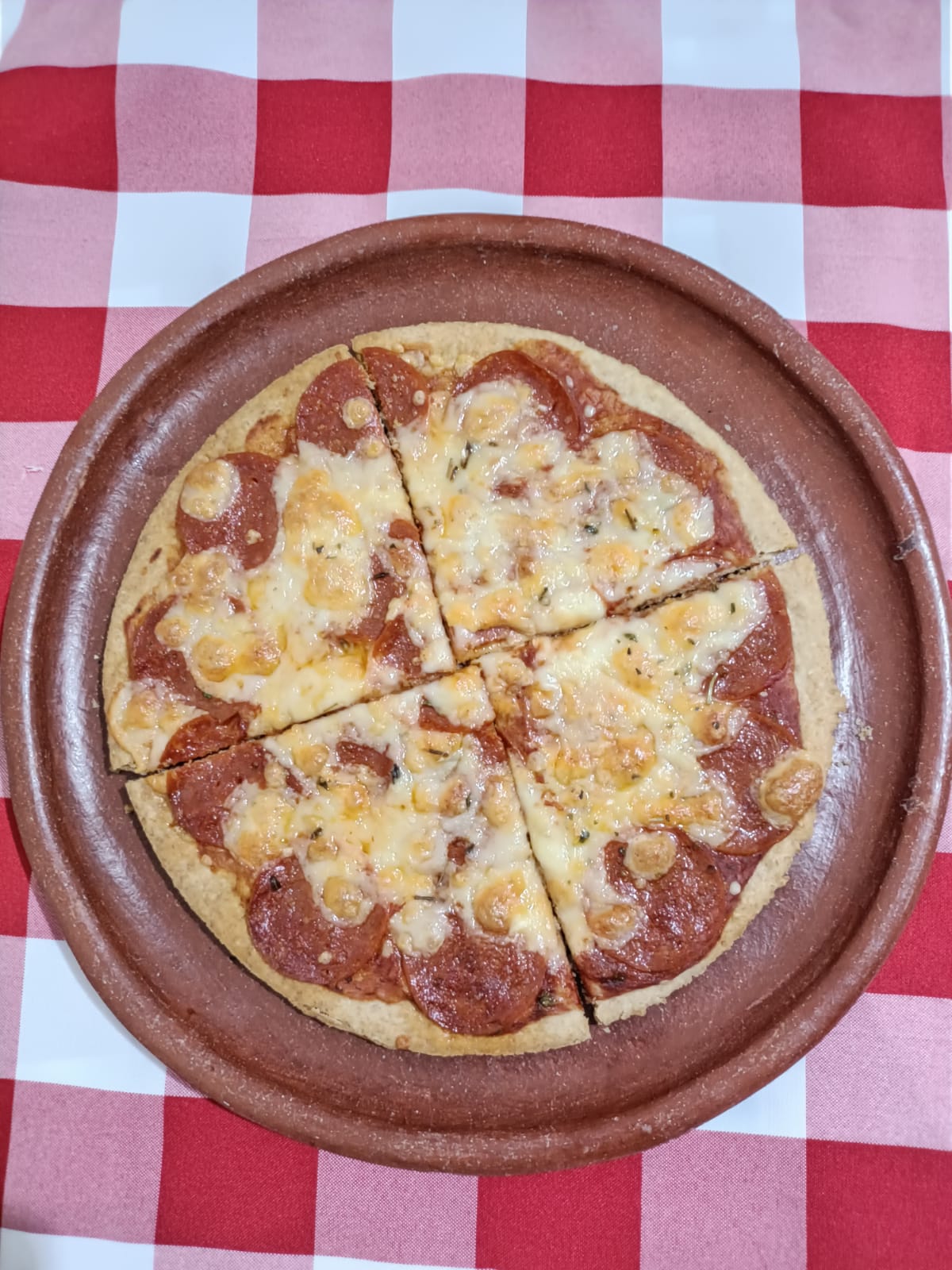 Base de avena con harina integral 23 cms aproximadamente, mezcla de quesos, salsa de tomate italiano y pepperoni.
