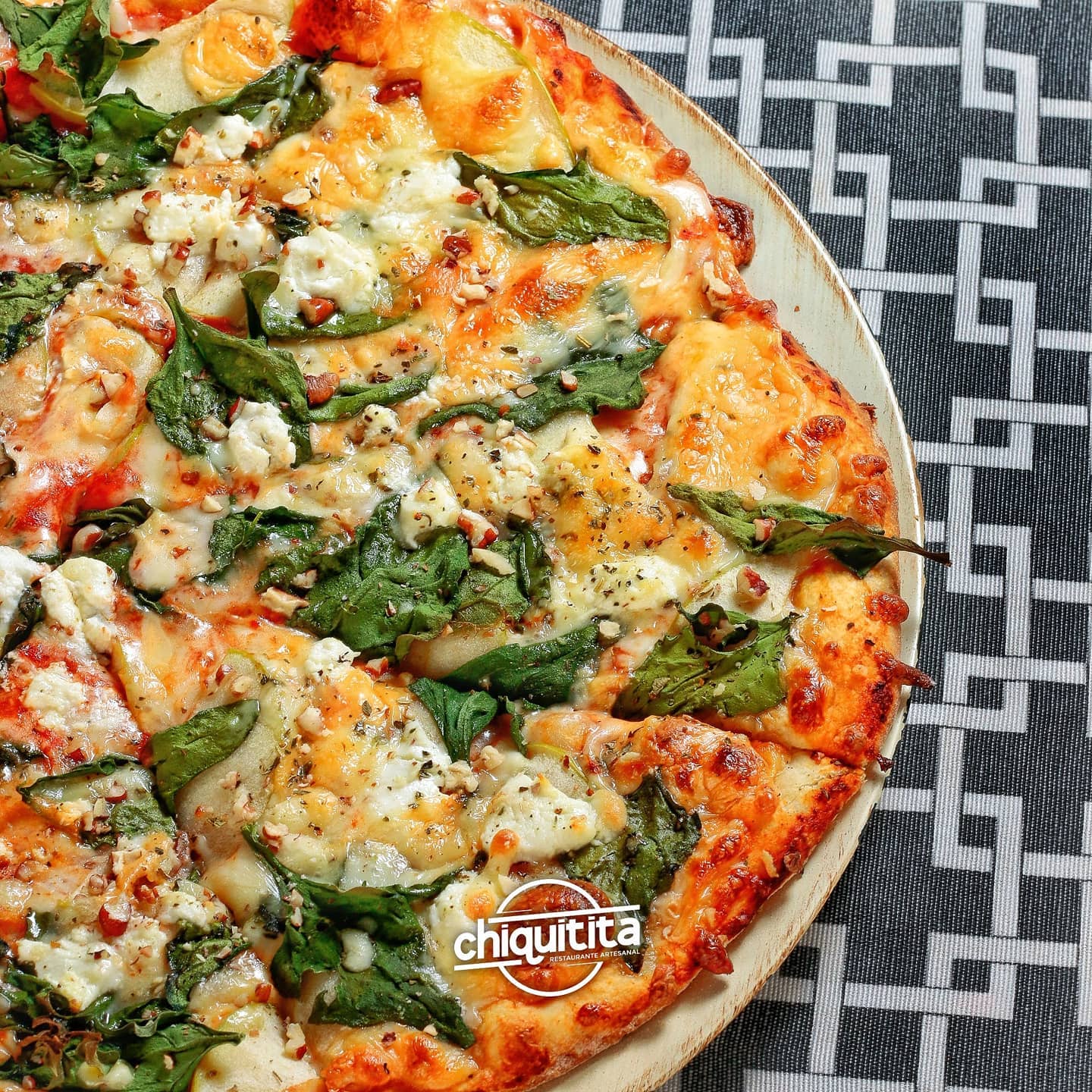 Base delgada tradicional 35 cms aproximadamente, mezcla de quesos, salsa de tomate italiano, espinaca, manzana verde, nuez, queso de cabra y queso azul.