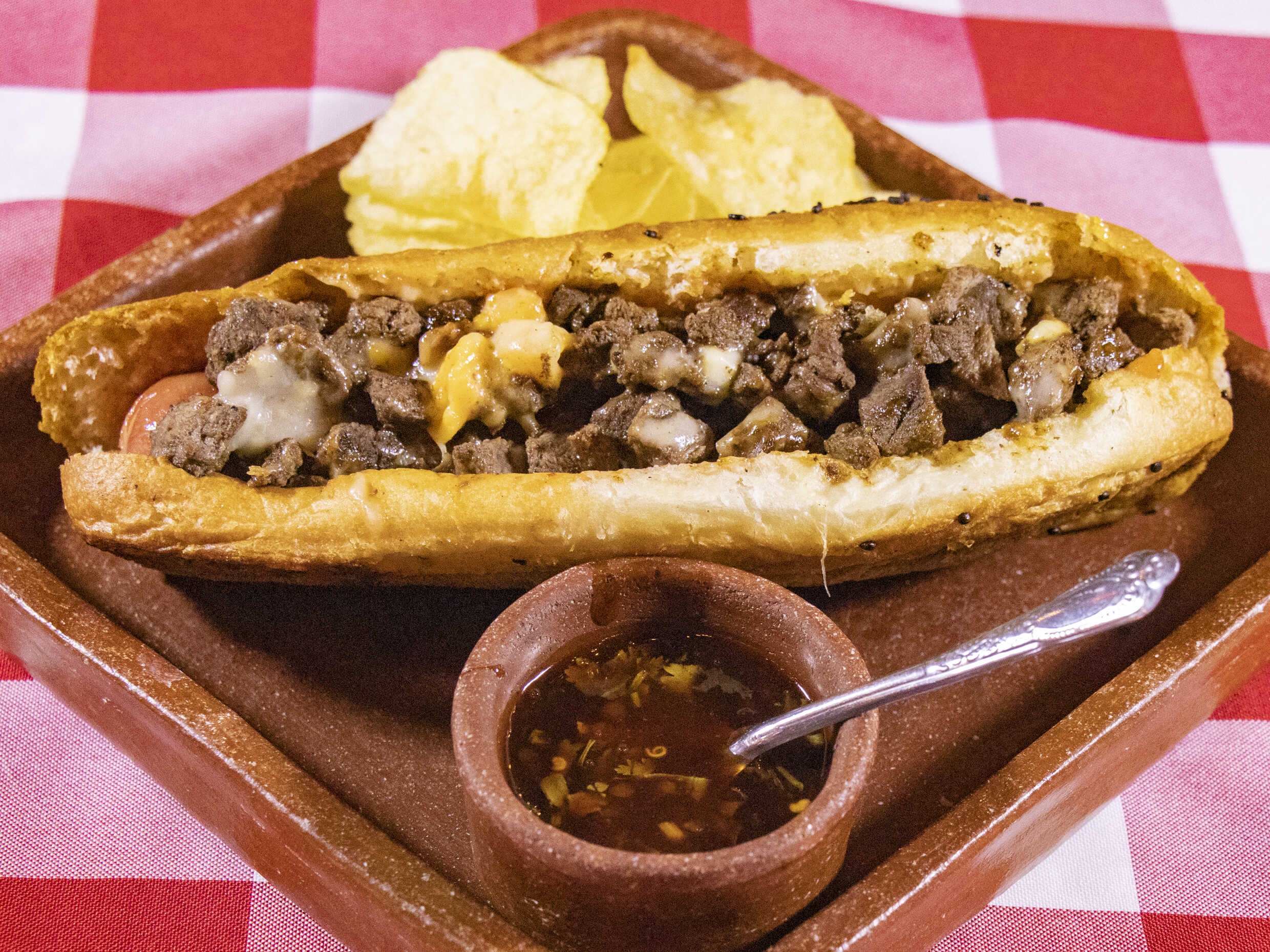 Pan artesanal, salchicha jumbo, mayonesa, mostaza, cátsup, arrachera marinada y mezcla de quesos.